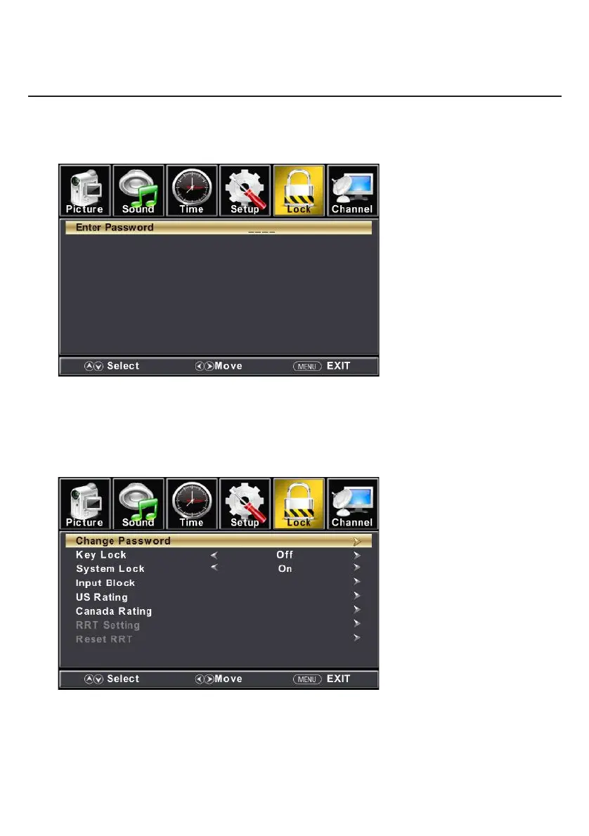 button to select among Change Password/Key Lock / System Lock / Input Block / US Rating / Canada Rating / Press ▼ / ▲