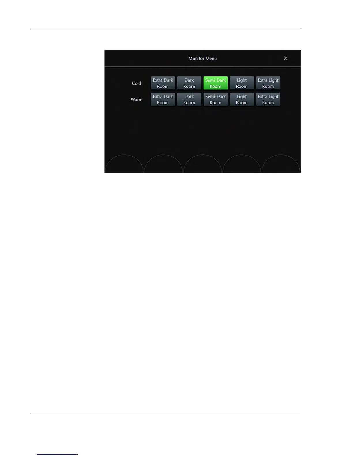 3. Touch the Semi-Dark Room button to load default monitor settings