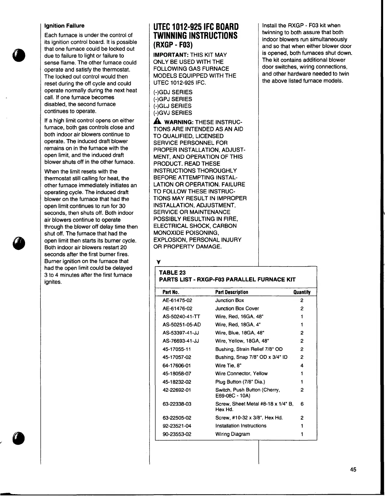 PARTS LIST - RXGP-F03 PARALLEL FURNACE KIT