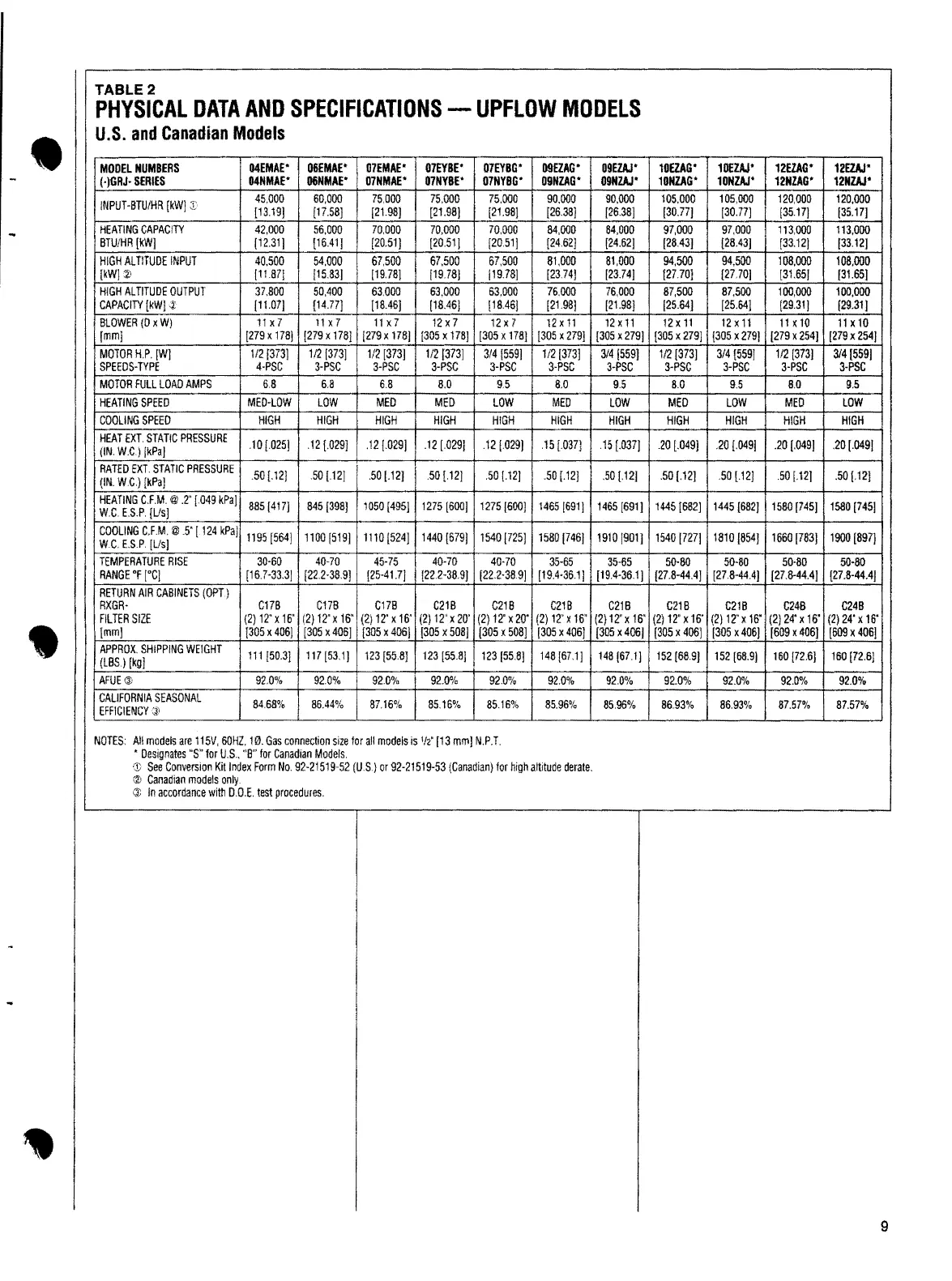 PHYSICALDATAAND SPECIFICATIONS UPFLOW- MODELS