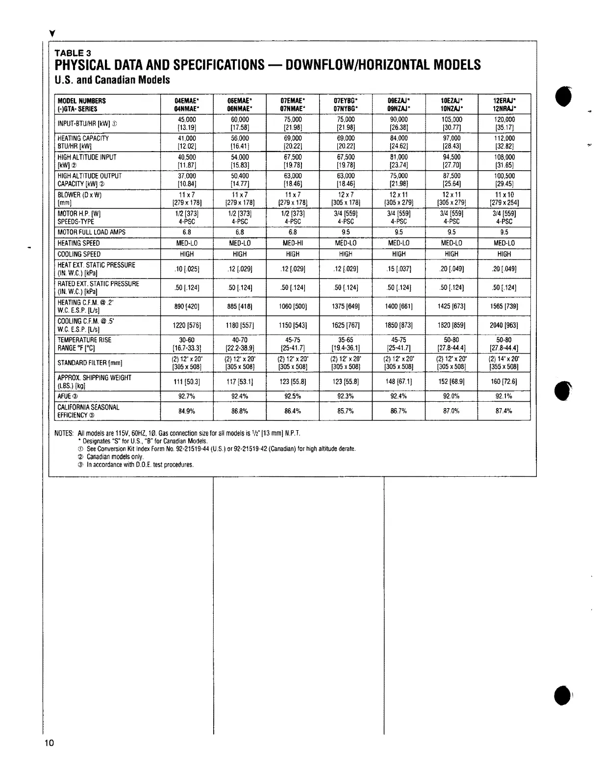 PHYSICALDATAAND SPECIFICATIONS DOWNFLOW/HORIZONTAL- MODELS