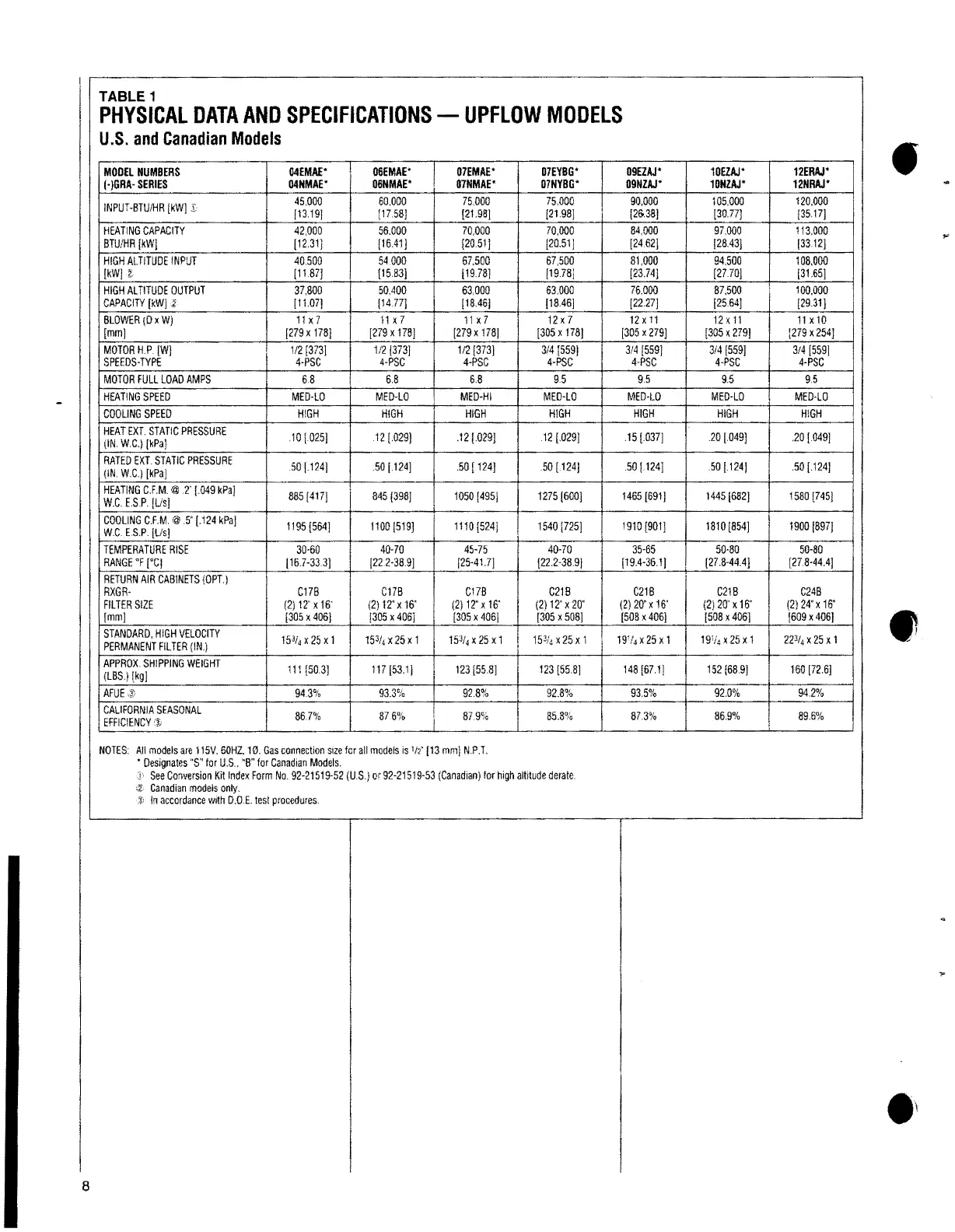 PHYSICALDATA - MODELSAND SPECIFICATIONS UPFLOW