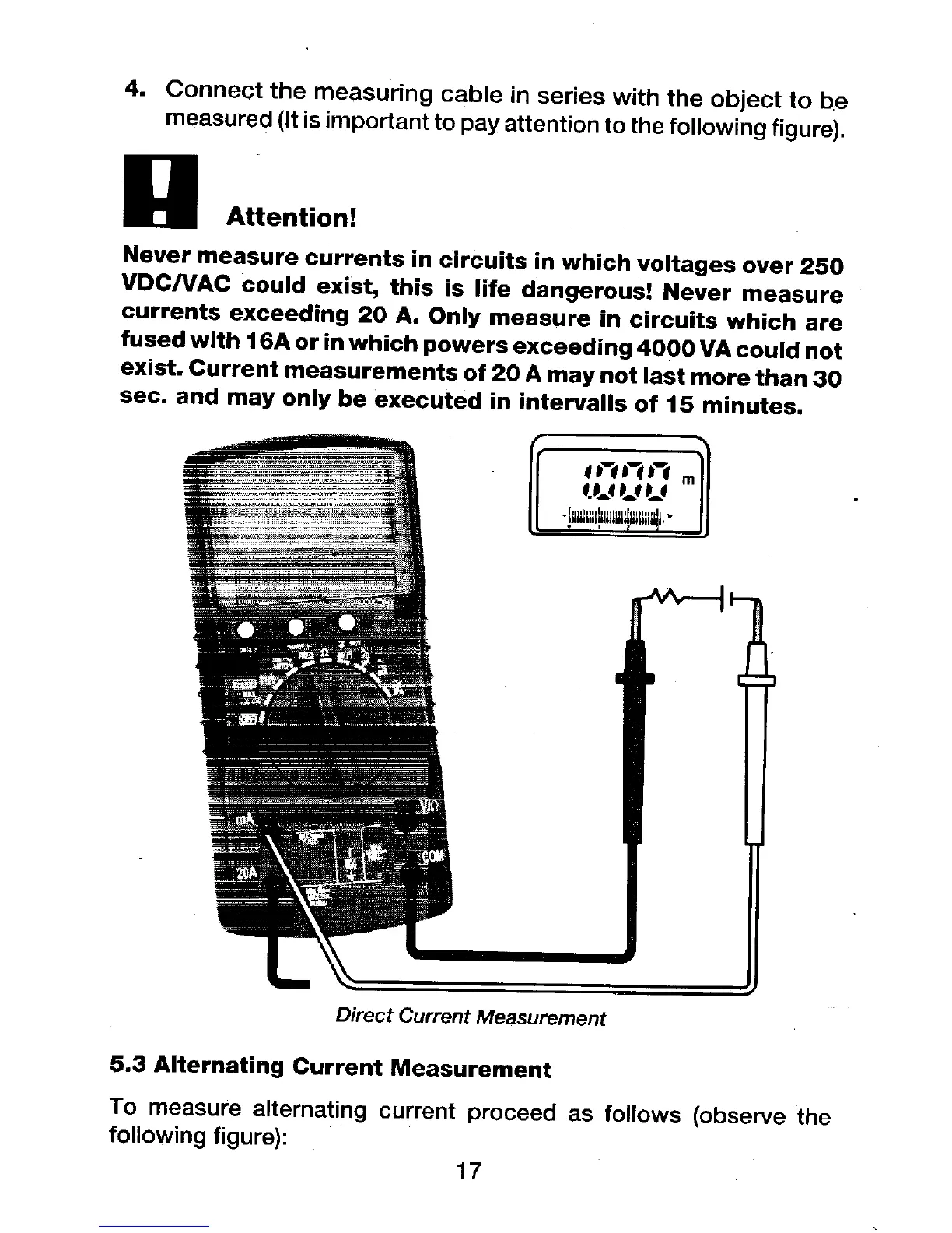 Conrad VC-300 - 5.2 Direct Current Measurement; DC Current Series Connection and Safety; 20 A DC Current Limits; AC Current Measurement Procedure