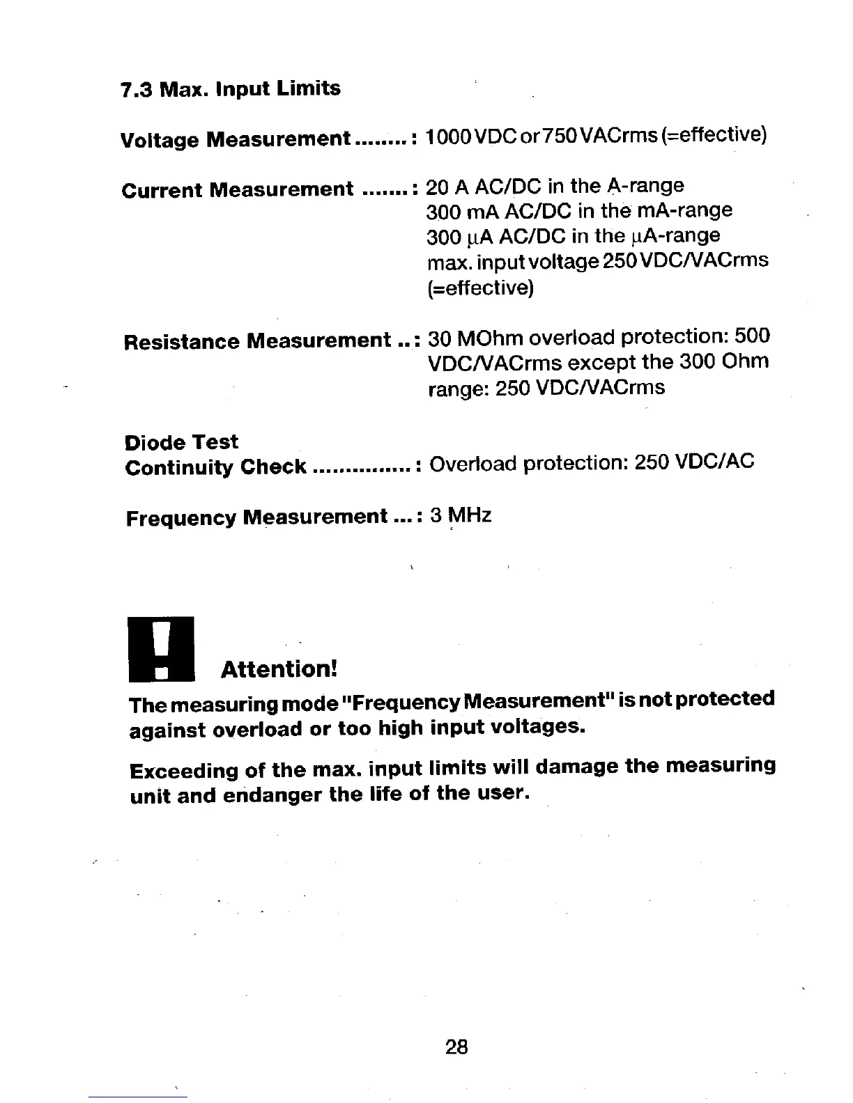 Conrad VC-300 - 7.3 Max. Input Limits; Voltage and Current Input Limits; Resistance, Diode, Frequency Input Limits; Frequency Overload and Exceeding Limits Warning