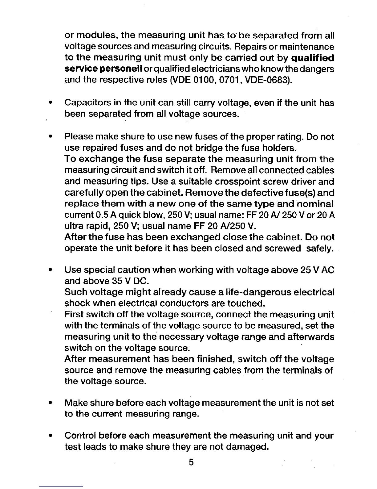Conrad VC-300 - Qualified Personnel and Capacitor Hazards; Fuse Replacement and High Voltage Caution; Safe Measurement Procedures