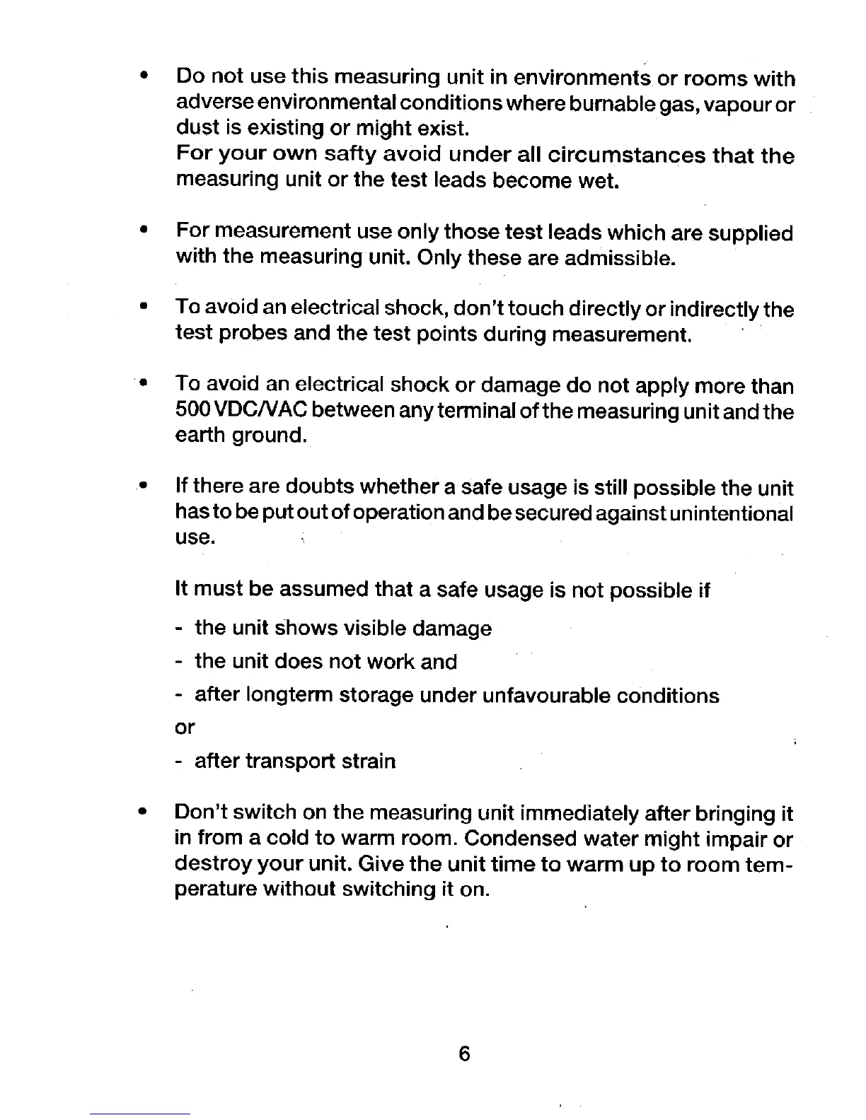 Conrad VC-300 - Environmental and Moisture Precautions; Test Lead and Contact Safety; Ground Voltage Limit and Operation Suspension