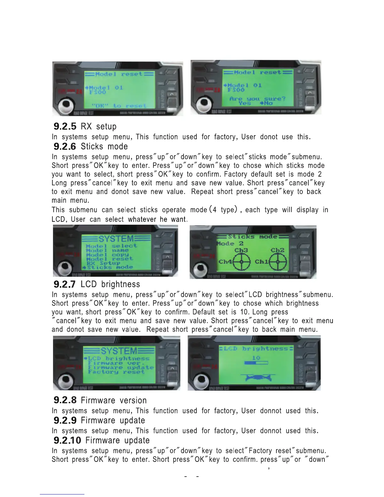 Conrad X-220 - 9.2.5 RX setup; 9.2.6 Sticks mode; 9.2.7 LCD brightness; 9.2.8 Firmware version