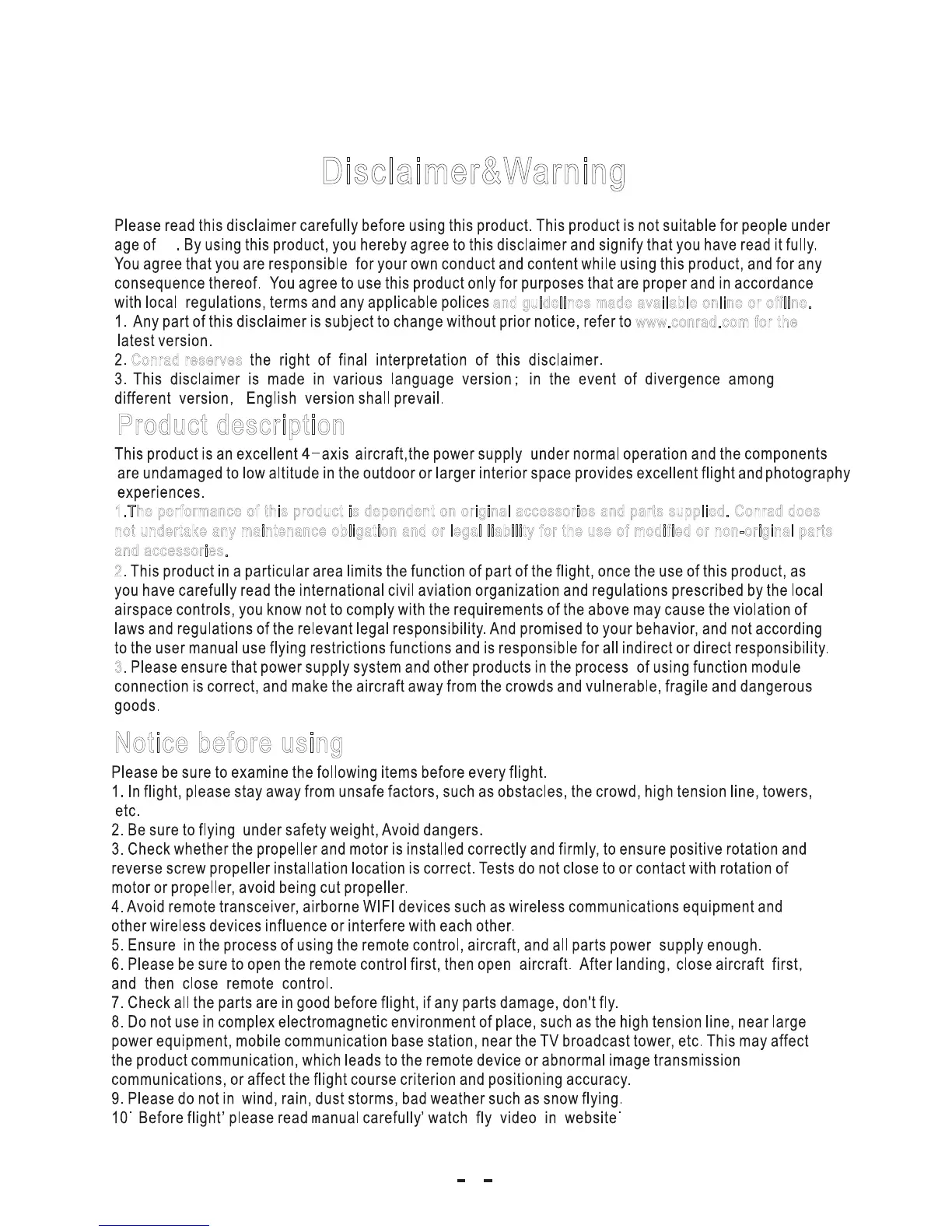 Conrad X-220 - Disclaimer & Warning; Product description; Notice before using