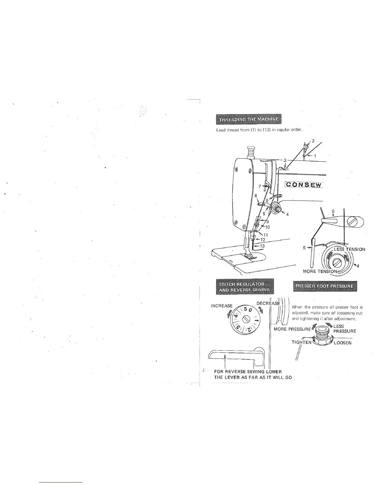 Consew 175 - Threading the Machine; Machine Adjustments and Controls; Stitch Regulator and Reverse Sewing; Presser Foot Pressure