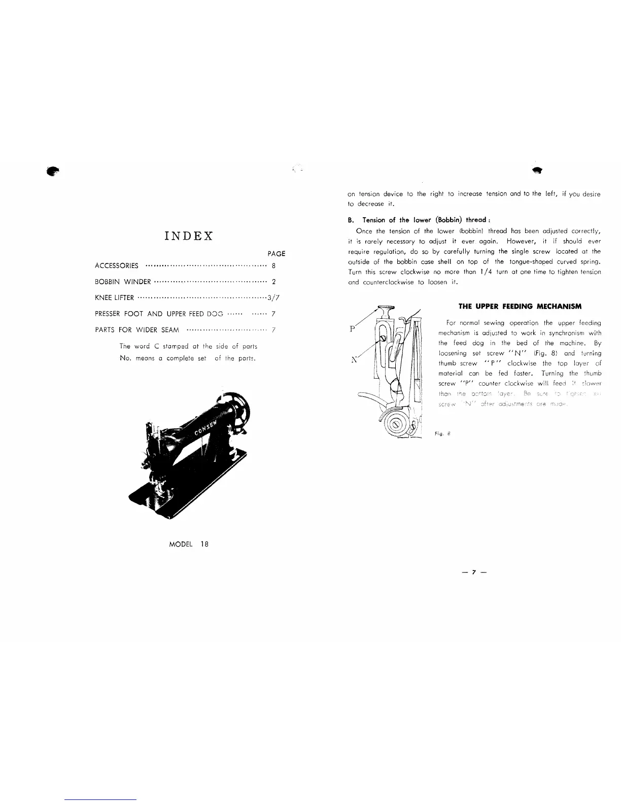 Consew 18 - Upper Feed Mechanism Adjustment; CONSEW Model 18;118 Parts Identification; Parts Index and Accessory Contents