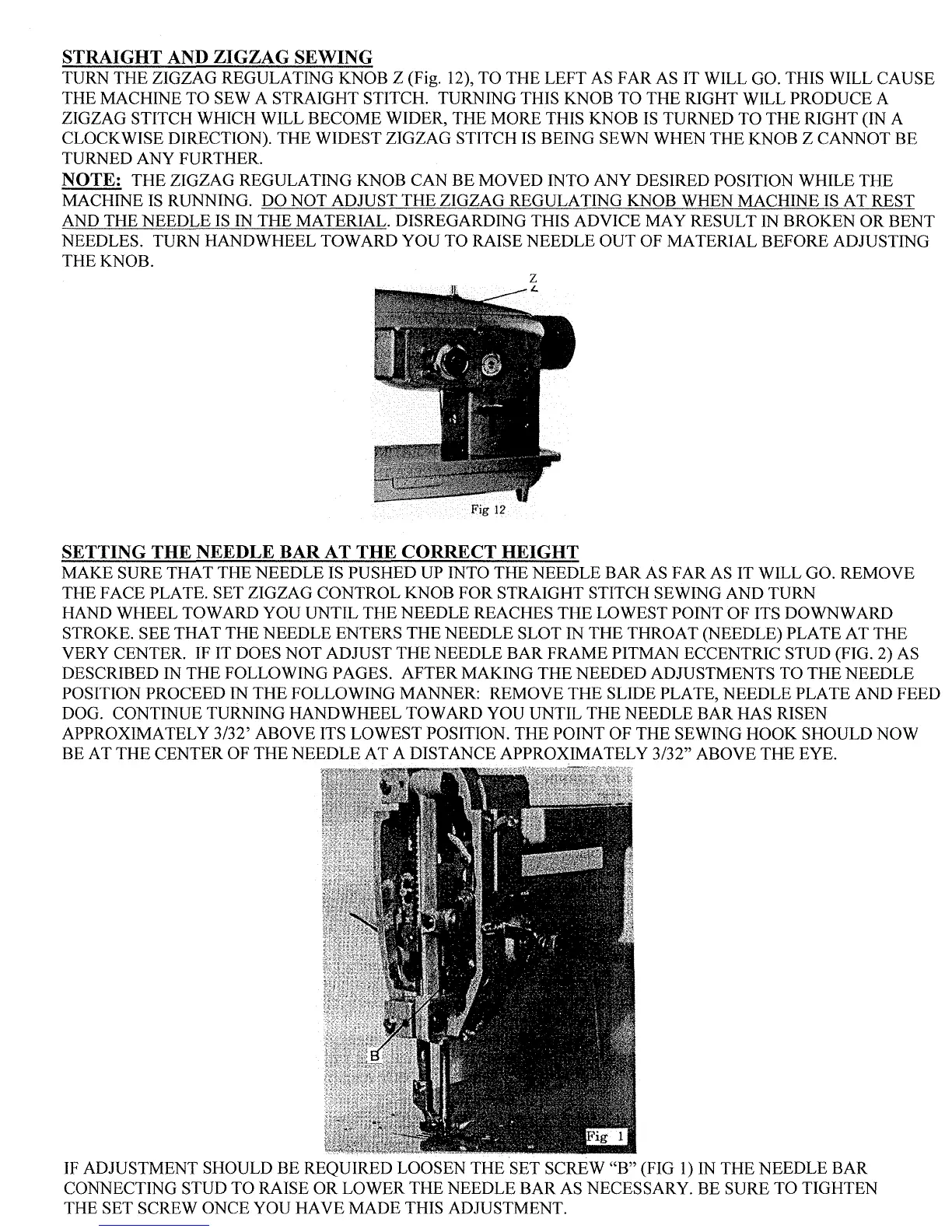 TURN THE ZIGZAG REGULATING KNOB Z (Fig. 12), TO THE LEFT AS FAR AS IT WILL GO. THIS WILL CAUSE