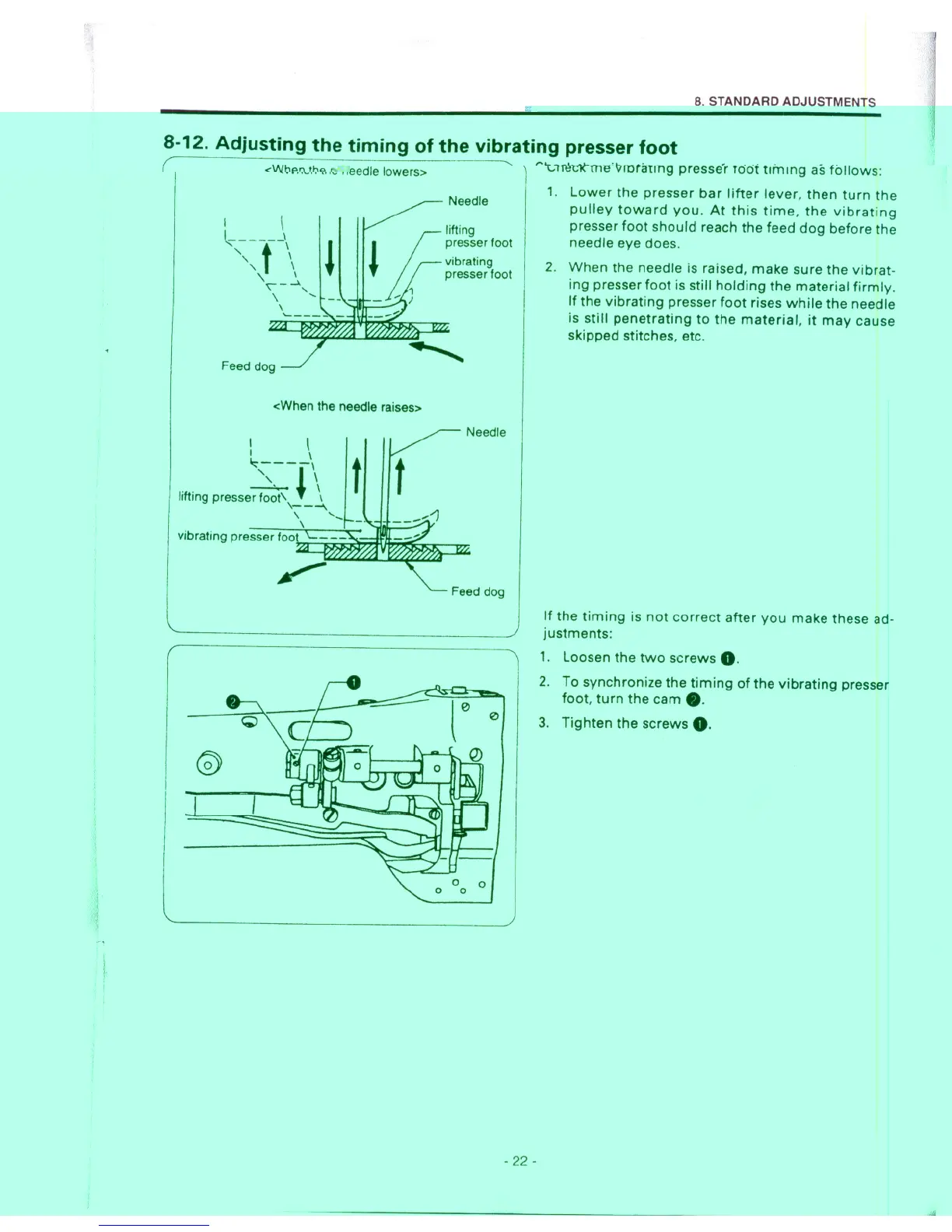 <Whentheneedlelowers> '1 Check the vibrating presser foot timing as follows: