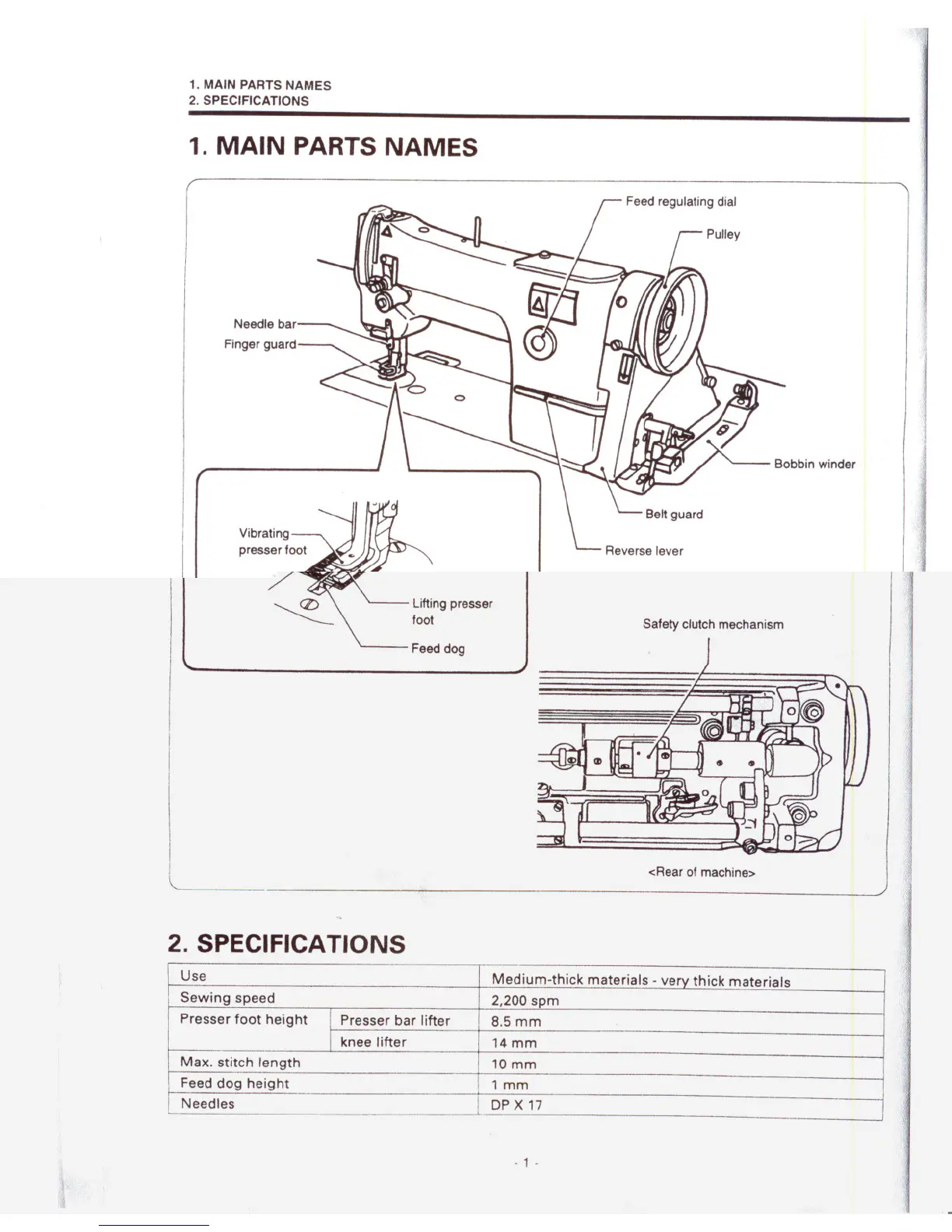 Consew 206RBL - Main Parts Identification; Machine Specifications