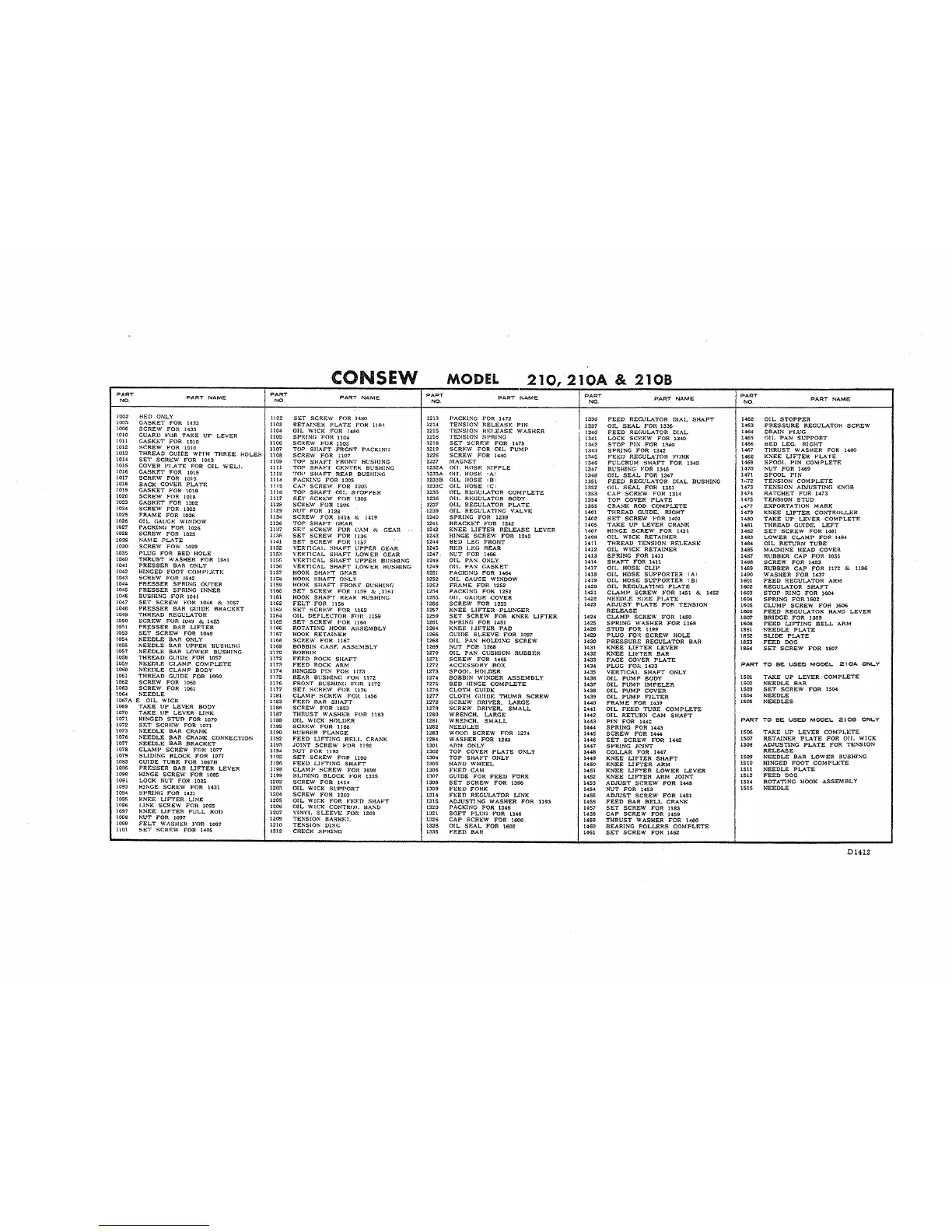 Consew 210 - Machine Parts List