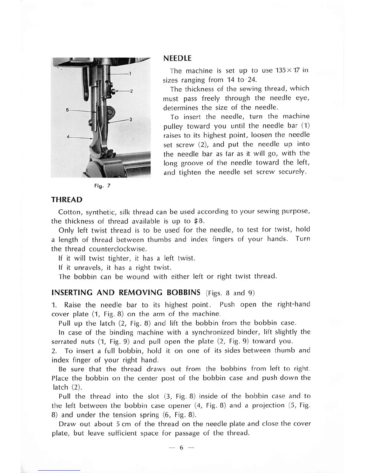 Pull the thread into the slot (3, Fig. 8) inside of the bobbin case and to