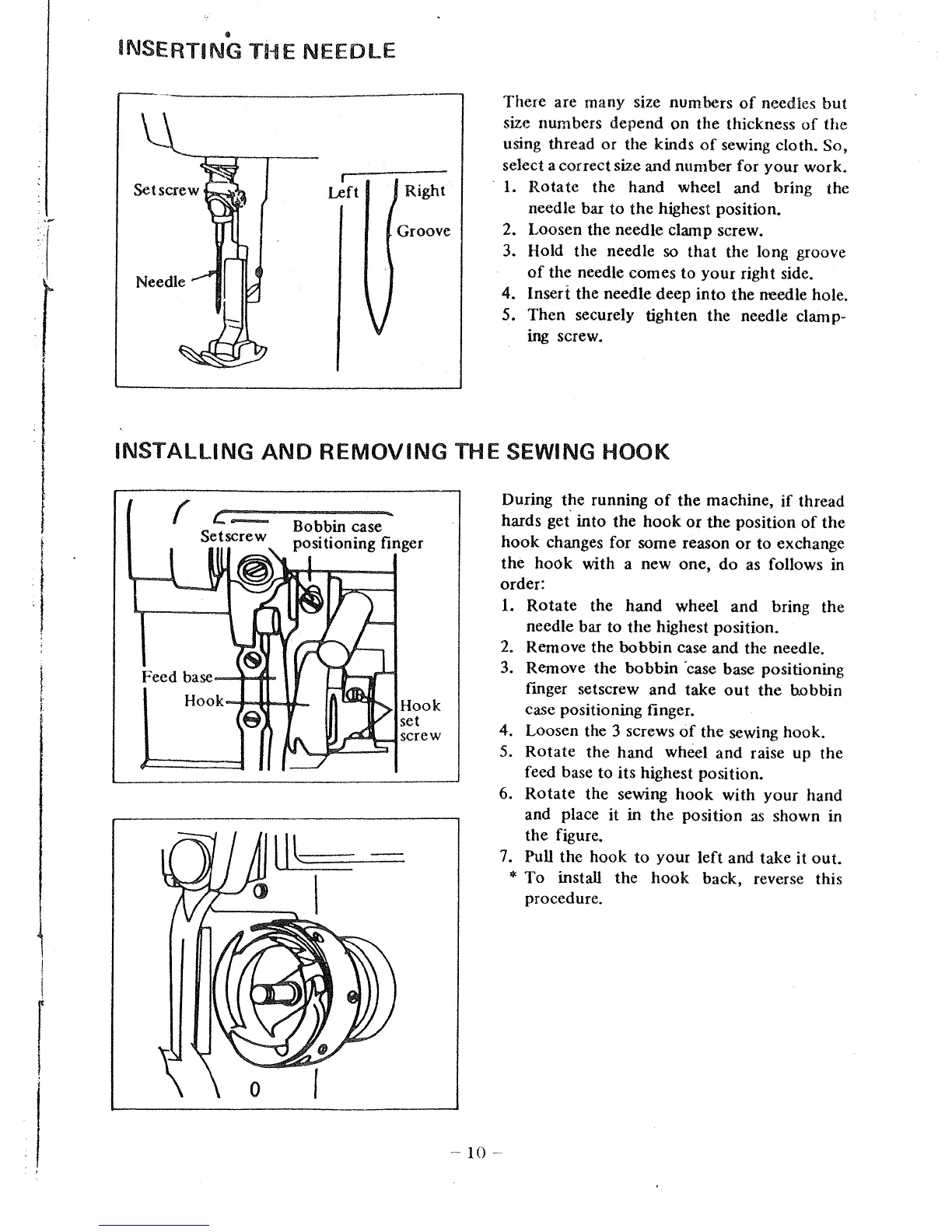 Consew DLS600 - Inserting the Needle; Installing and Removing the Sewing Hook