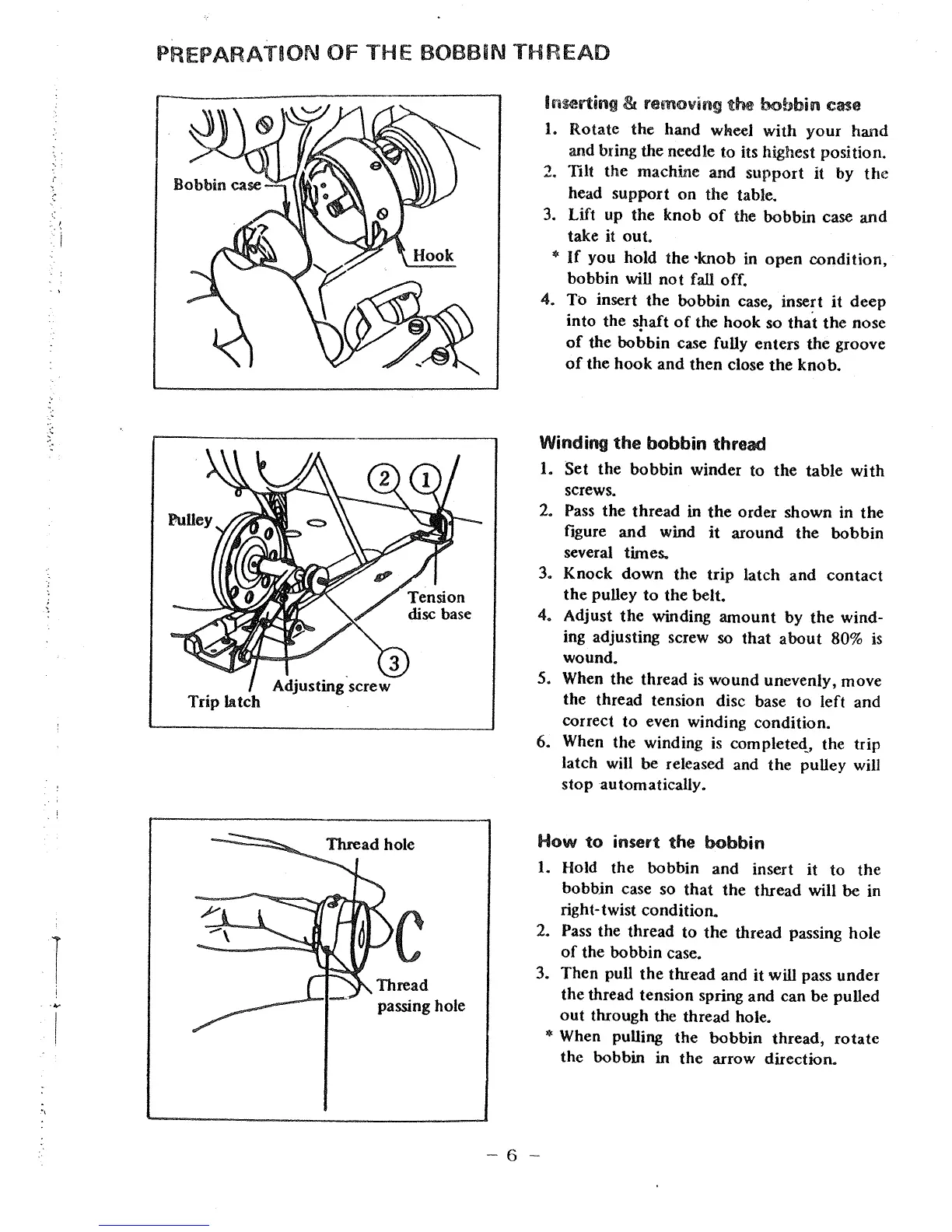 Consew DLS600 - Preparation of the Bobbin Thread; Inserting & removing the bobbin case; Winding the bobbin thread; How to insert the bobbin