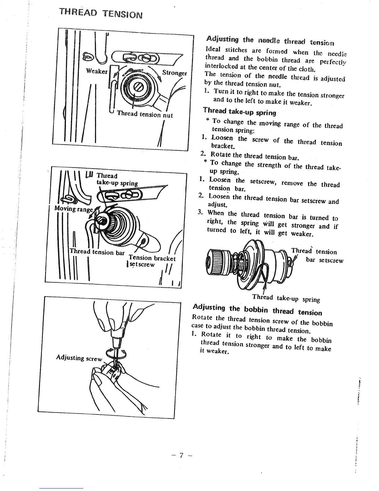 Consew DLS600 - Thread Tension; Adjusting the needle thread tension; Thread take-up spring adjustment; Adjusting the bobbin thread tension