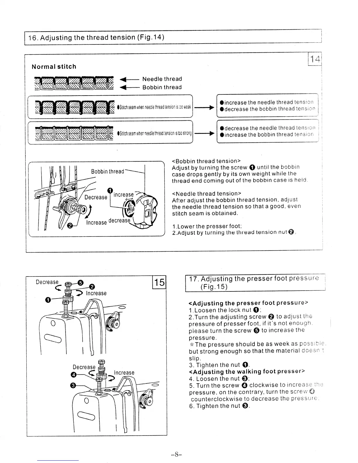 Consew P1206RB - 16. Adjusting the thread tension; 17. Adjusting the presser foot pressure