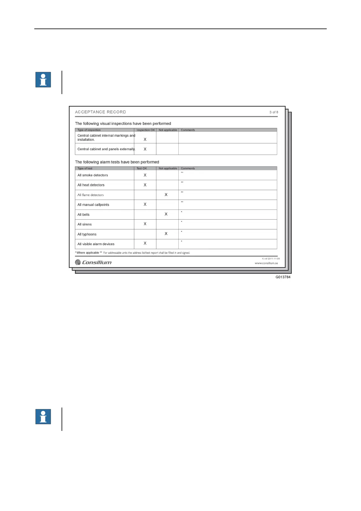 Use Consilium document Acceptance Record for fire detection systems if nothing