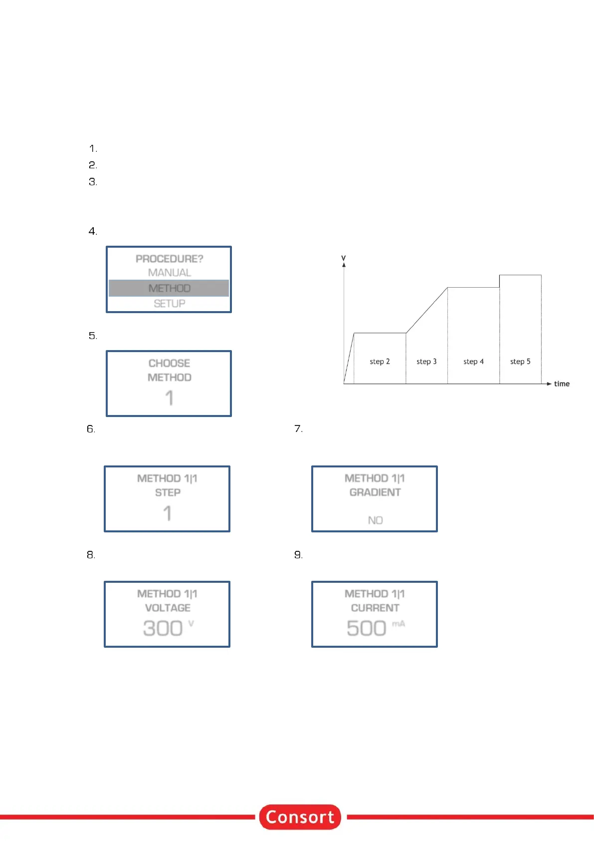 Method programming permits to store up to 9 different methods, each with 9 steps, of frequently used