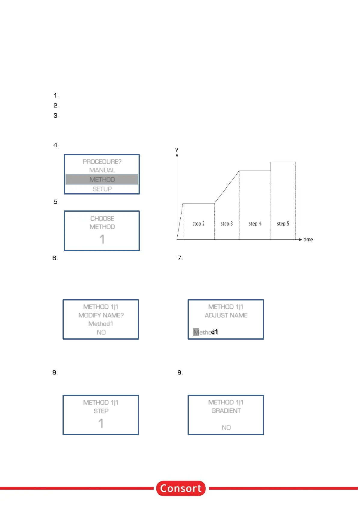Method programming permits to store up to 9 different methods, each with 9 steps. Each step is able to