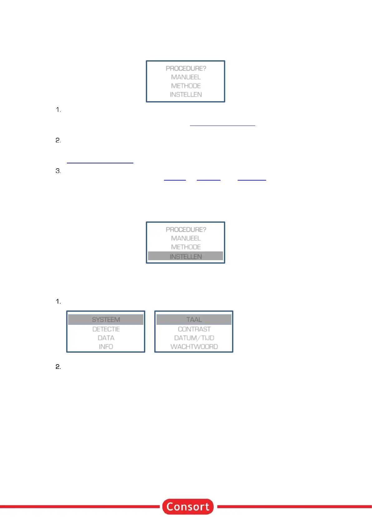 Dit menu laat toe de systeeminstellingen te wijzigen van het toestel voor taal, contrast uitlezing, tijdsklok,