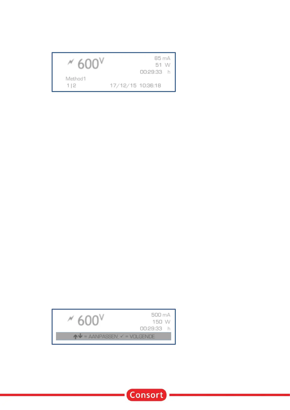 Tijdens het verloop van een procedure toont het scherm de actuele parameters. Deze aflezing is verdeeld in