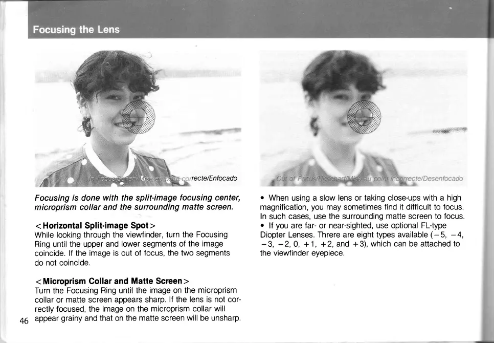 Contax 167MT - Focusing the Lens; Horizontal Split-Image Spot; Microprism Collar and Matte Screten