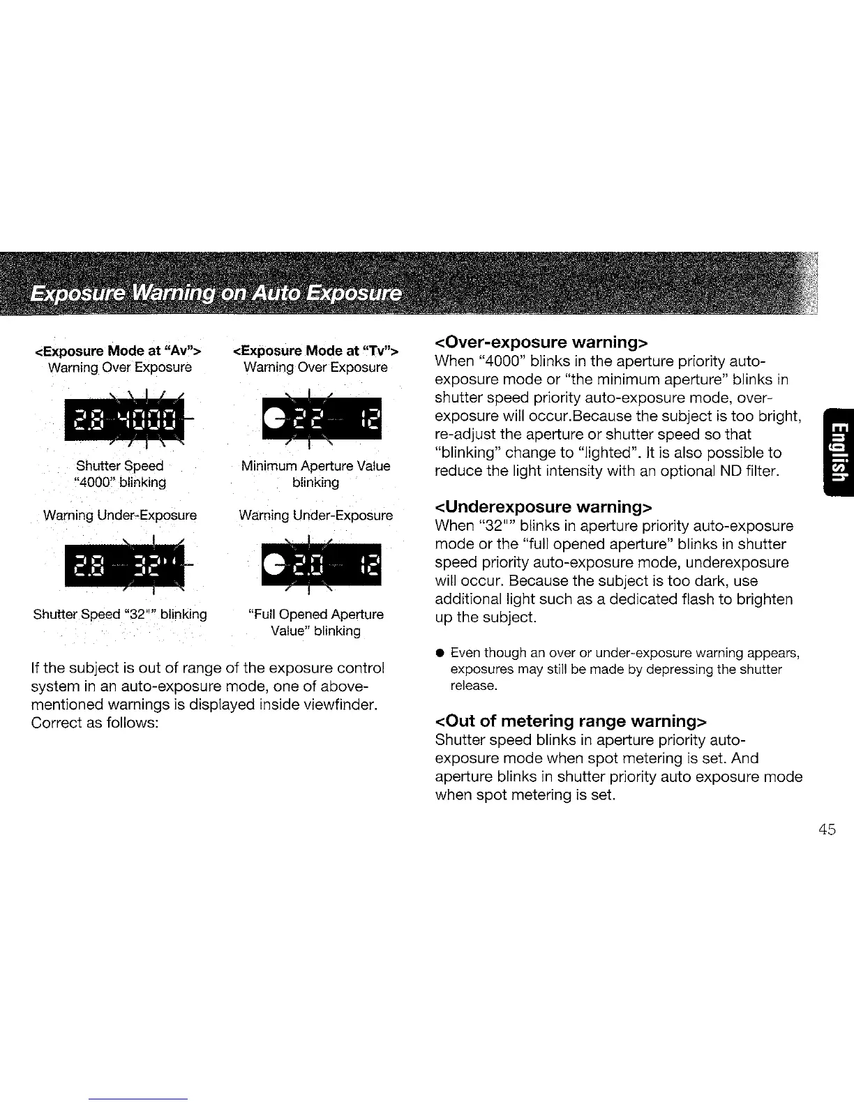 Contax 645 - Exposure Warnings in Auto Exposure; Over-exposure Warning Indicators; Under-exposure Warning Indicators; Metering Range Warning