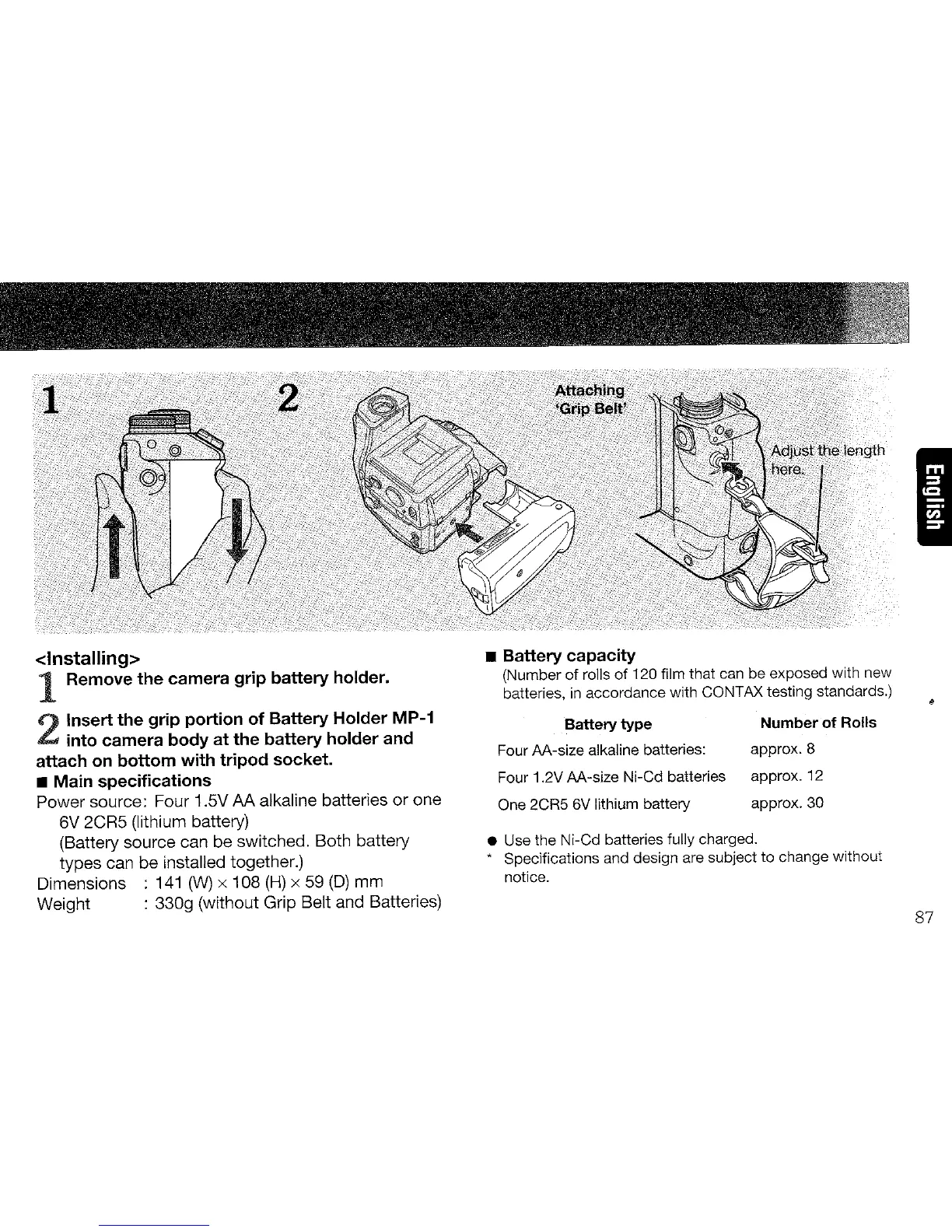 Contax 645 - Installing the Battery Holder MP-1; Installation Procedure; Battery Specifications and Capacity