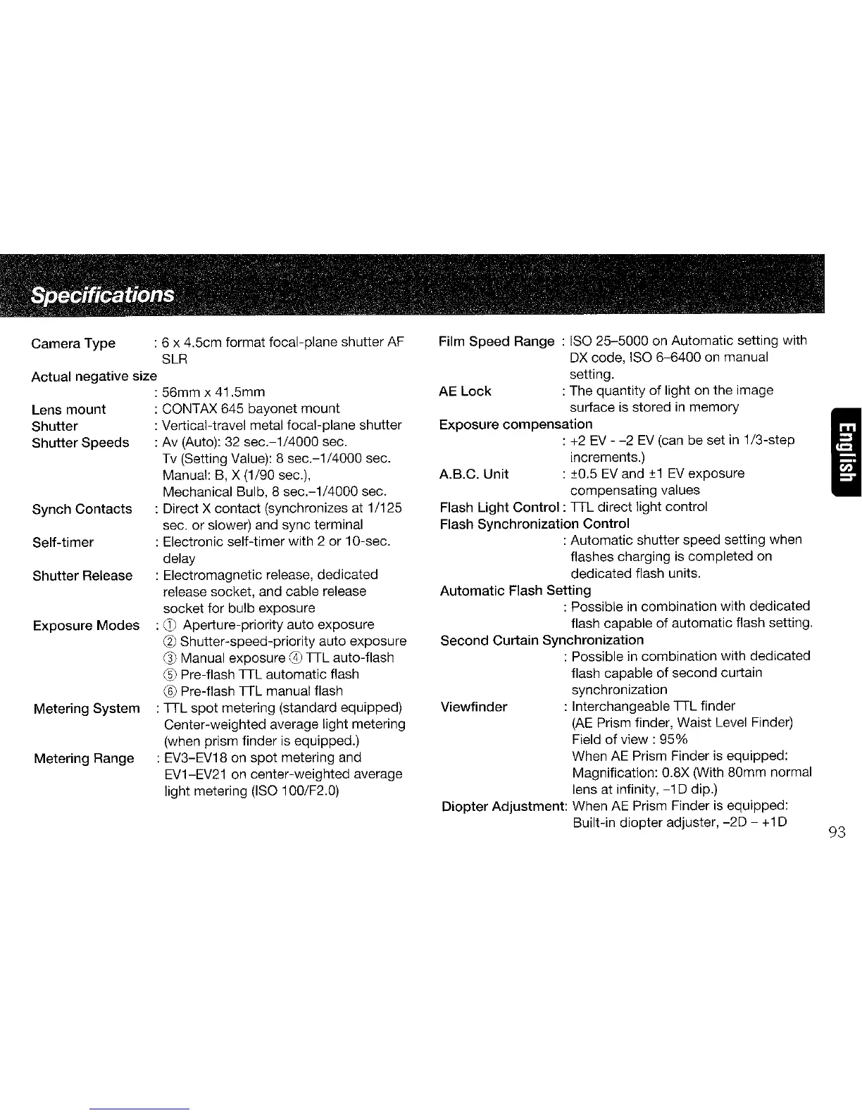 Contax 645 - Specifications