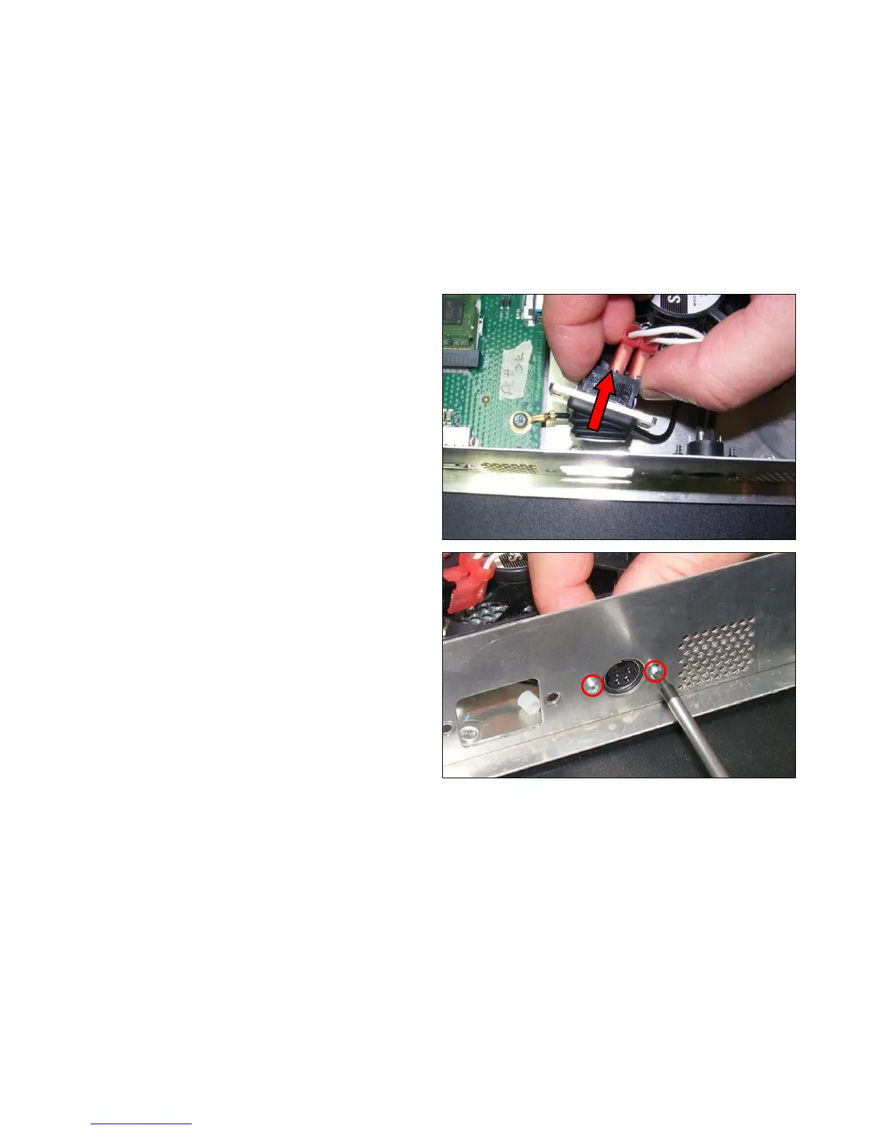 4. Remove the 2 x T8 screws, from the power connector.