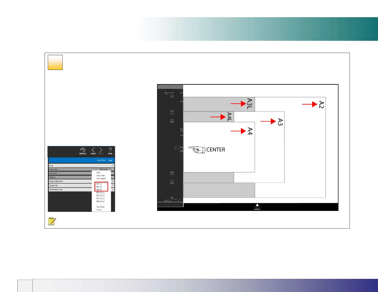 NOTE: A2 (L) and A1 (L) documents are scanned long-side against the guide in two stages using the Wizard. See the Oversize scanning section.