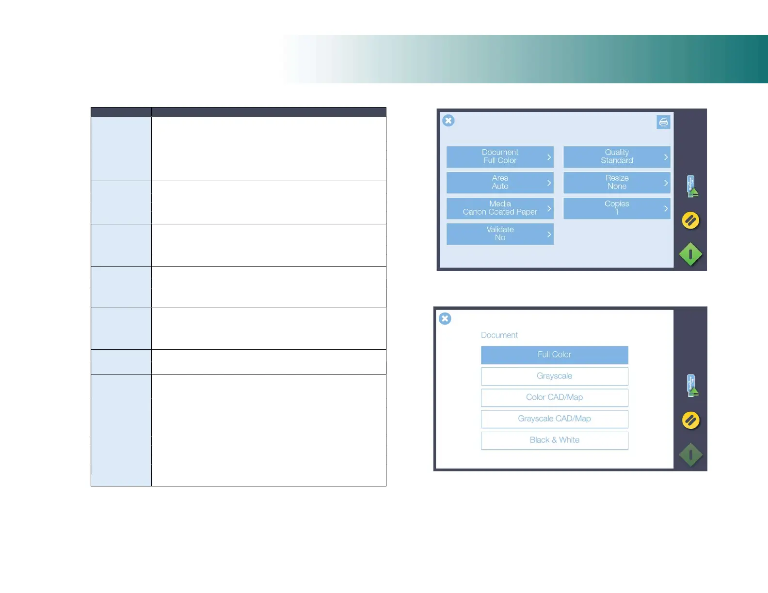 (Above) Menu to change: Document Color, Copy Quality, Copy Size
