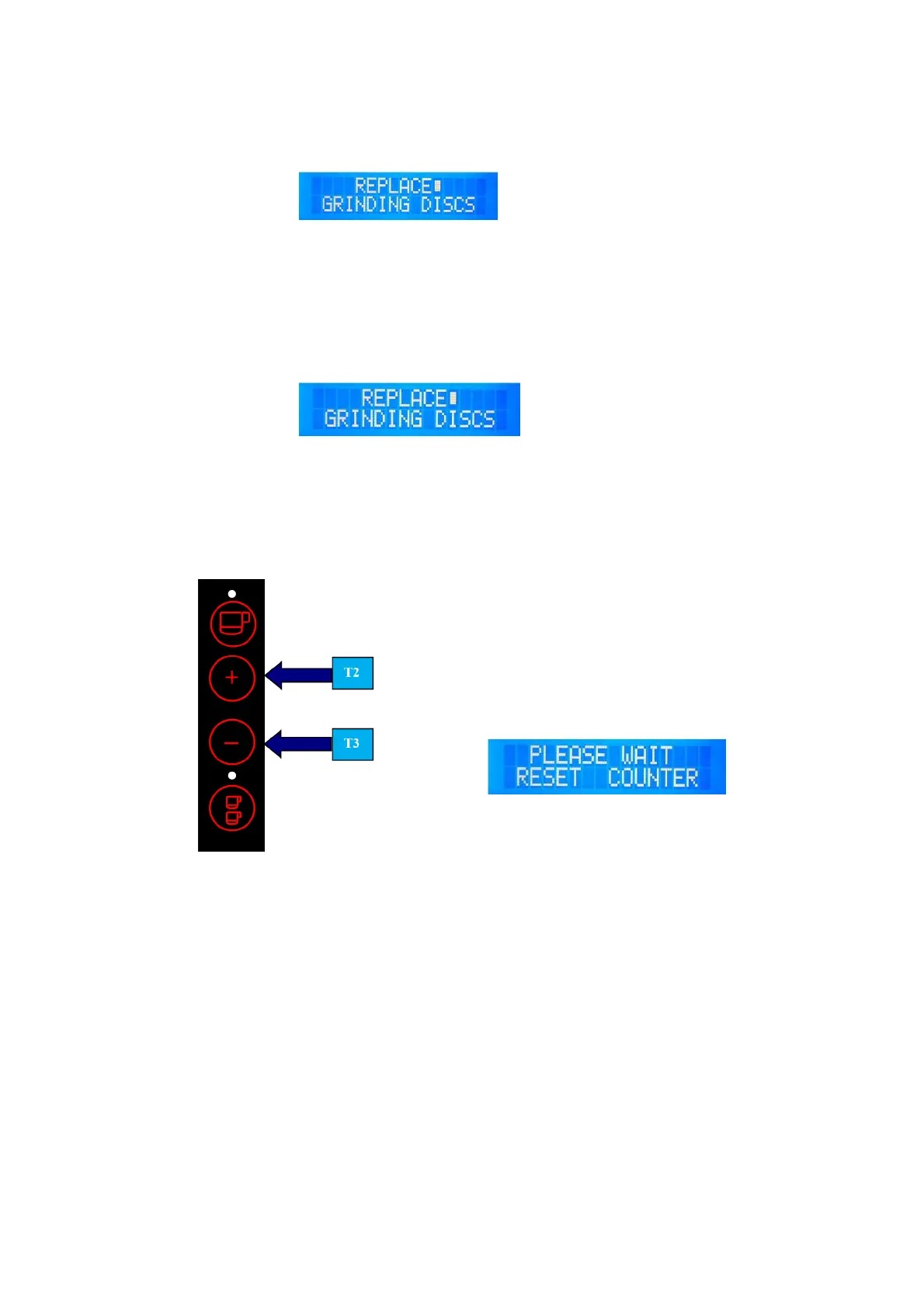 After replacing the worn grinding discs, reset the warning message. Switch-off grinder, push T2 and T3