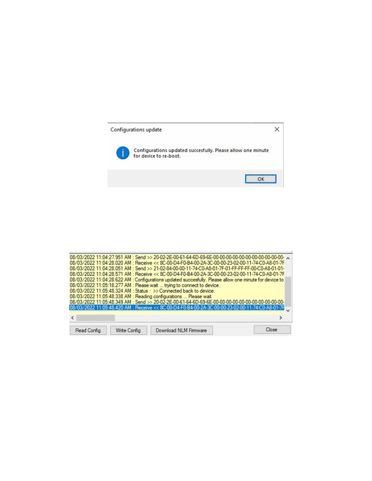 18. Upon clicking the Read Config or Write Config buttons, the data retrieved or written to the device, will