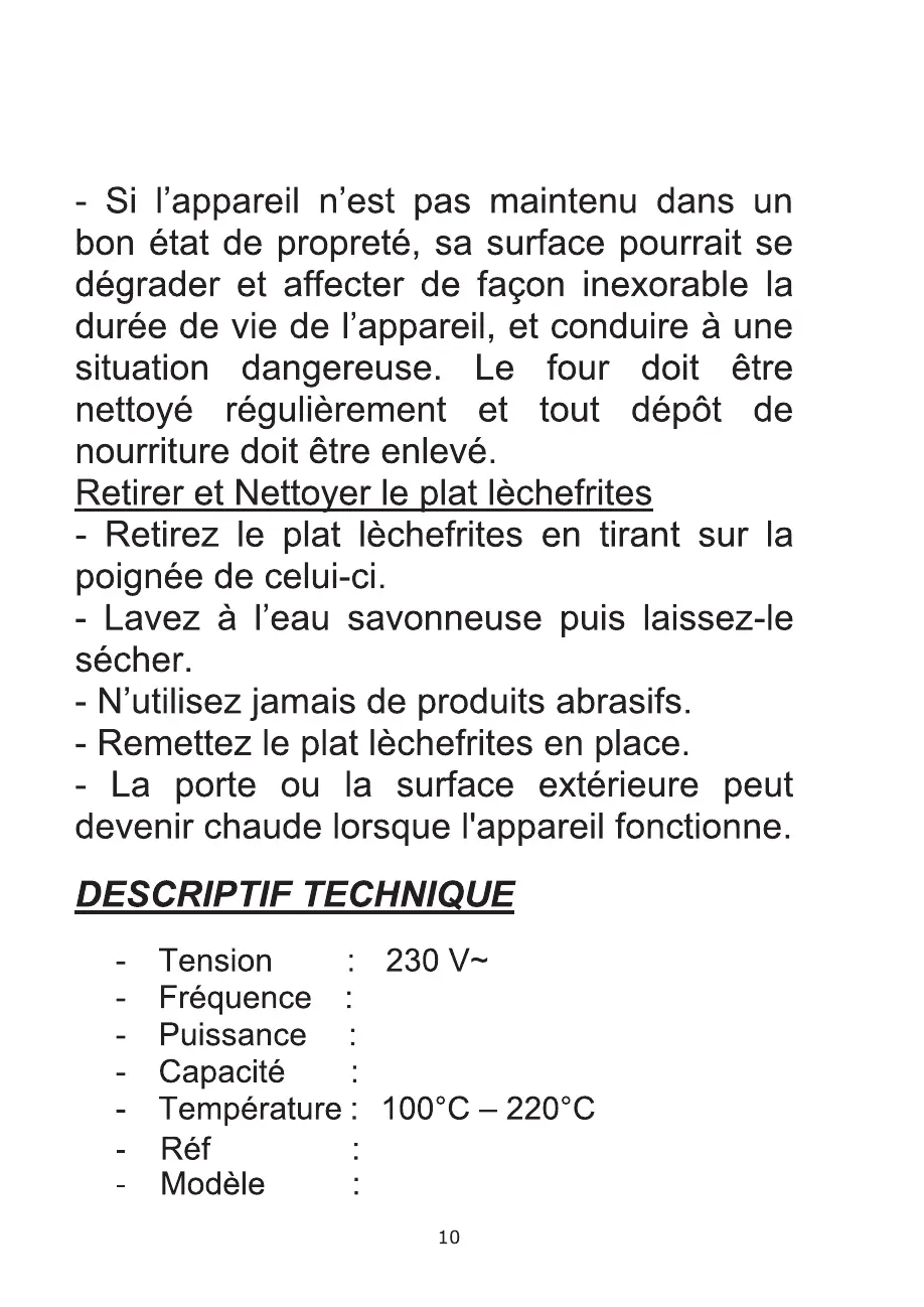 CONTINENTAL EDISON CEMF23B - Retirer et Nettoyer le plat lèchefrites; DESCRIPTIF TECHNIQUE