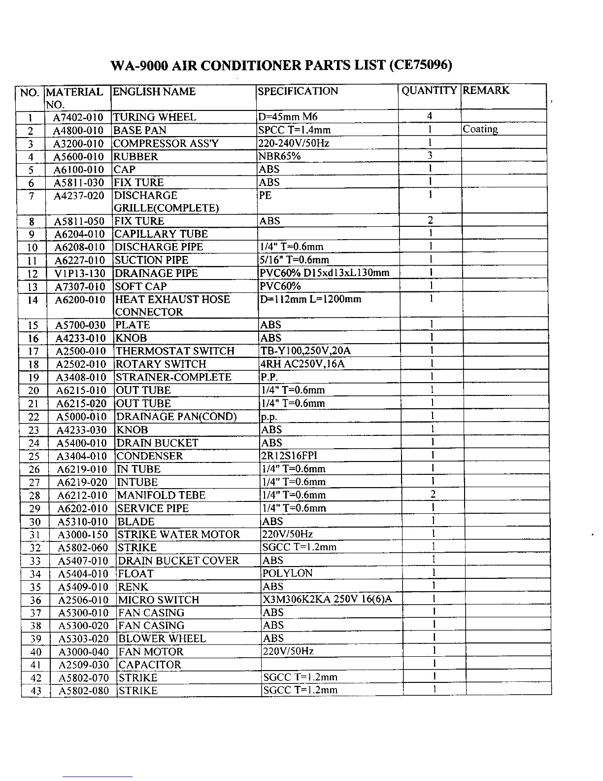 WA-9000 AIR CONDITIONER PARTS LIST (CE75096)