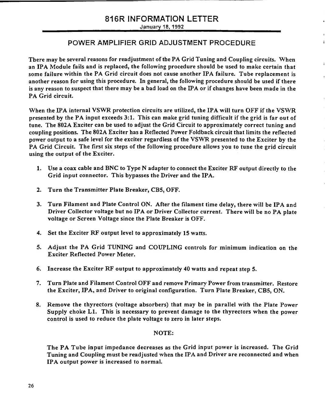 Continental Electronics 816R - PA Grid Adjustment Procedure