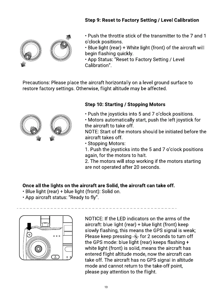 Precautions: Please place the aircraft horizontally on a level ground surface to