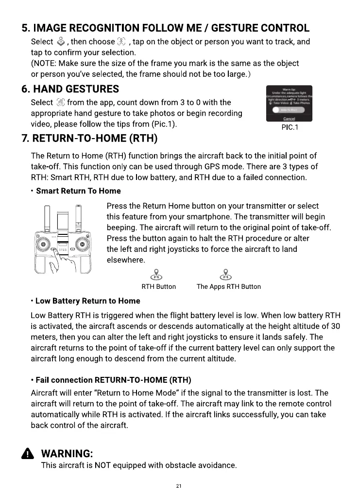 aircraft will return to the point of take-off. The aircraft may link to the remote control