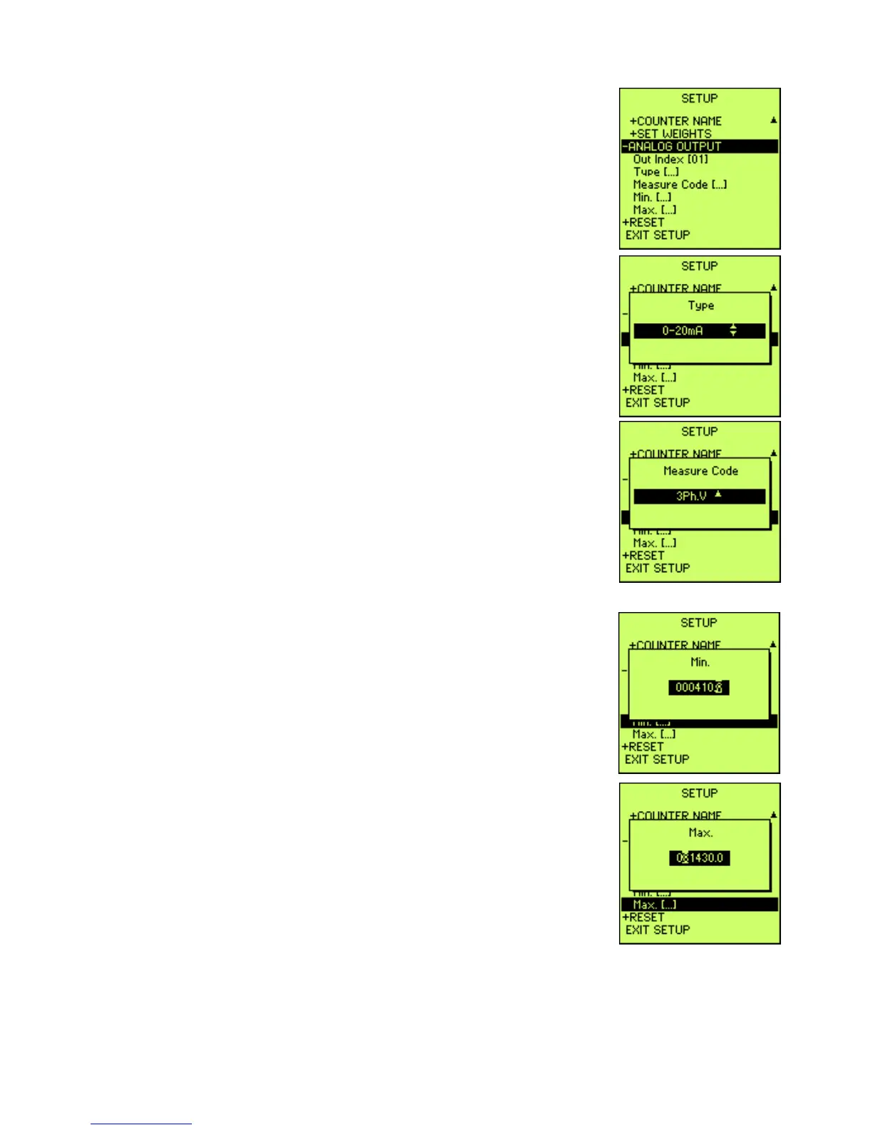 • Type, allows to select the value of current output, (disabled, 0-20mA, 4-