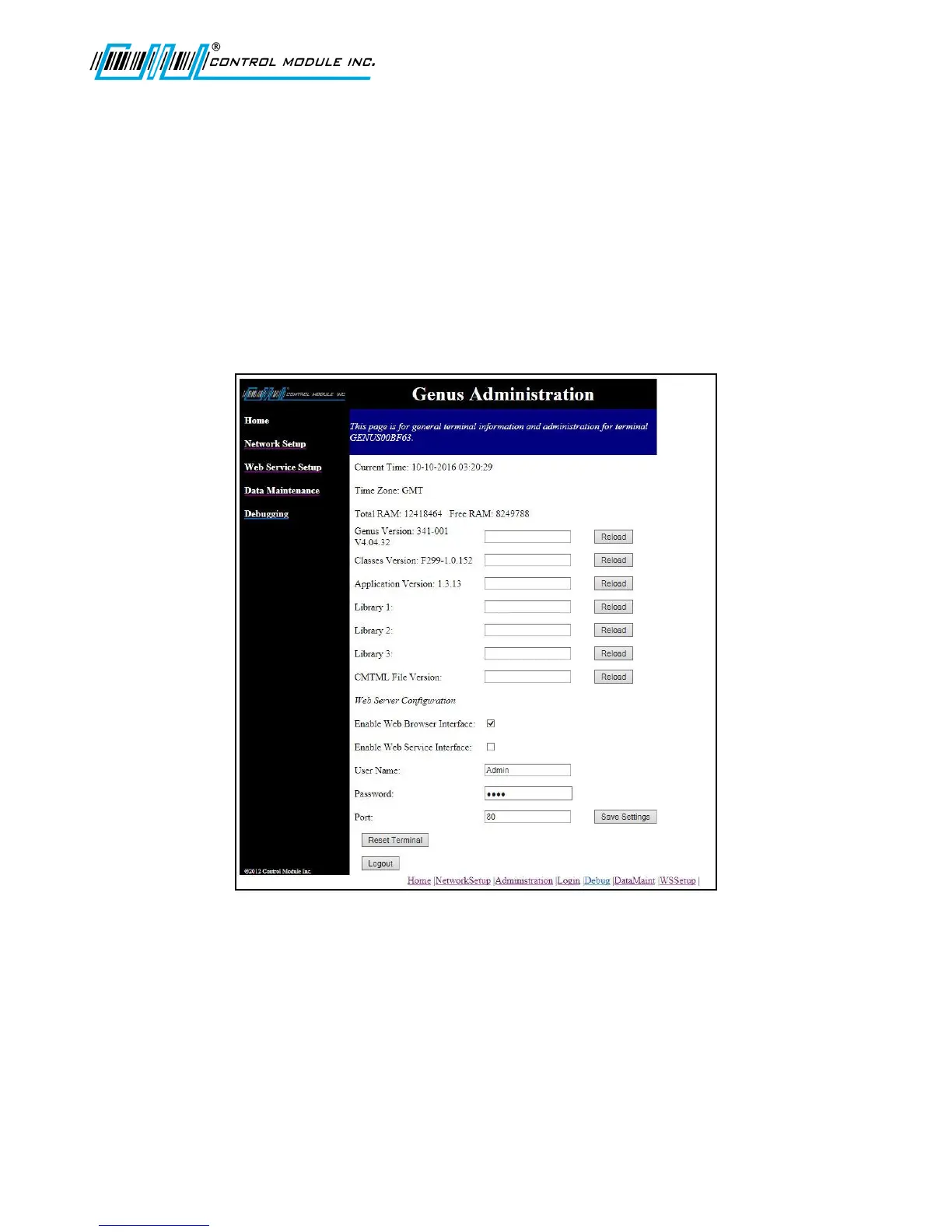Once logged in to the terminal, the Genus Administration home page is displayed. The Genus