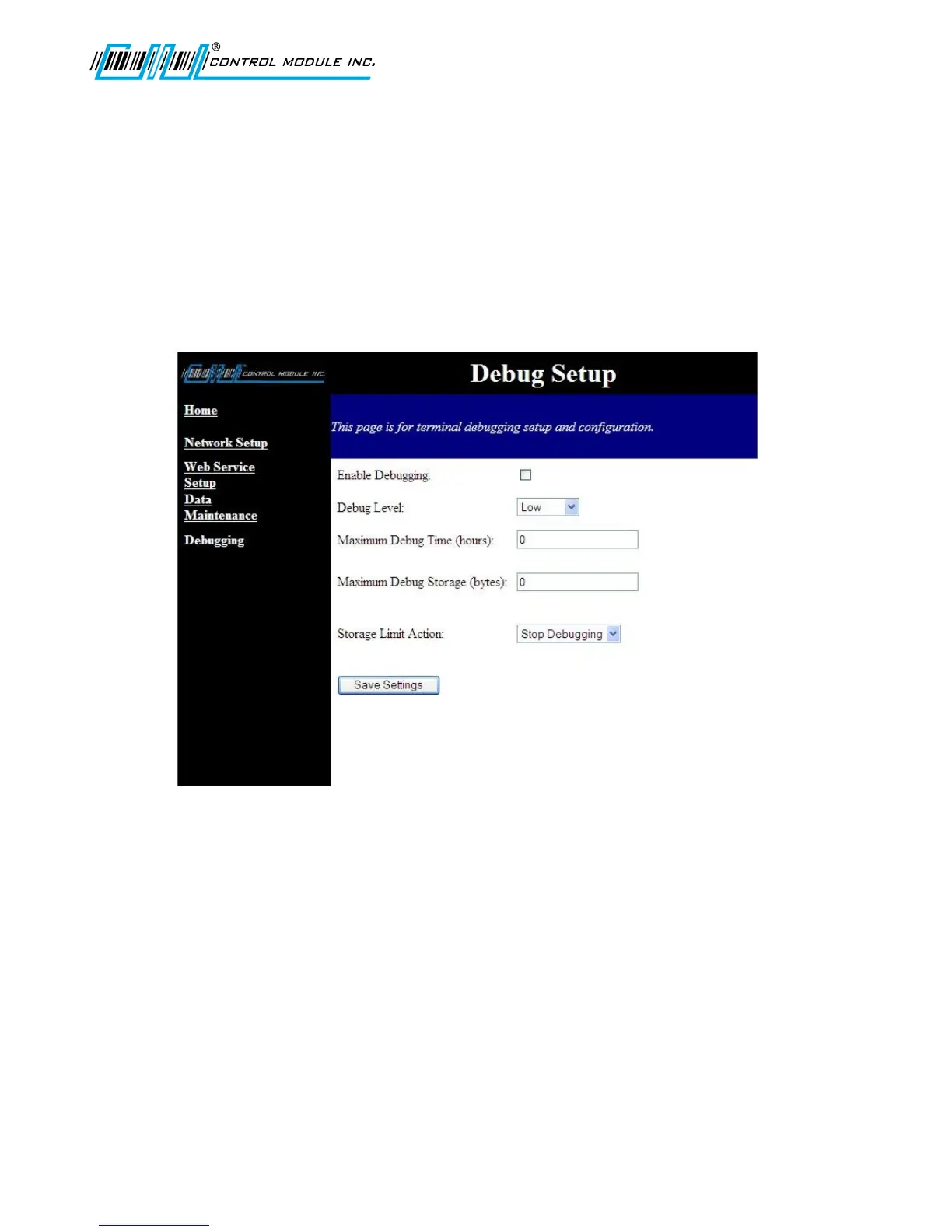 The Debug Setup page allows an administrator to enable application and system debugging.