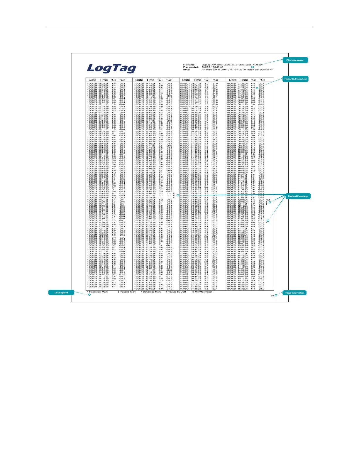 and temperature values for each channel, plus any special events that were recorded
