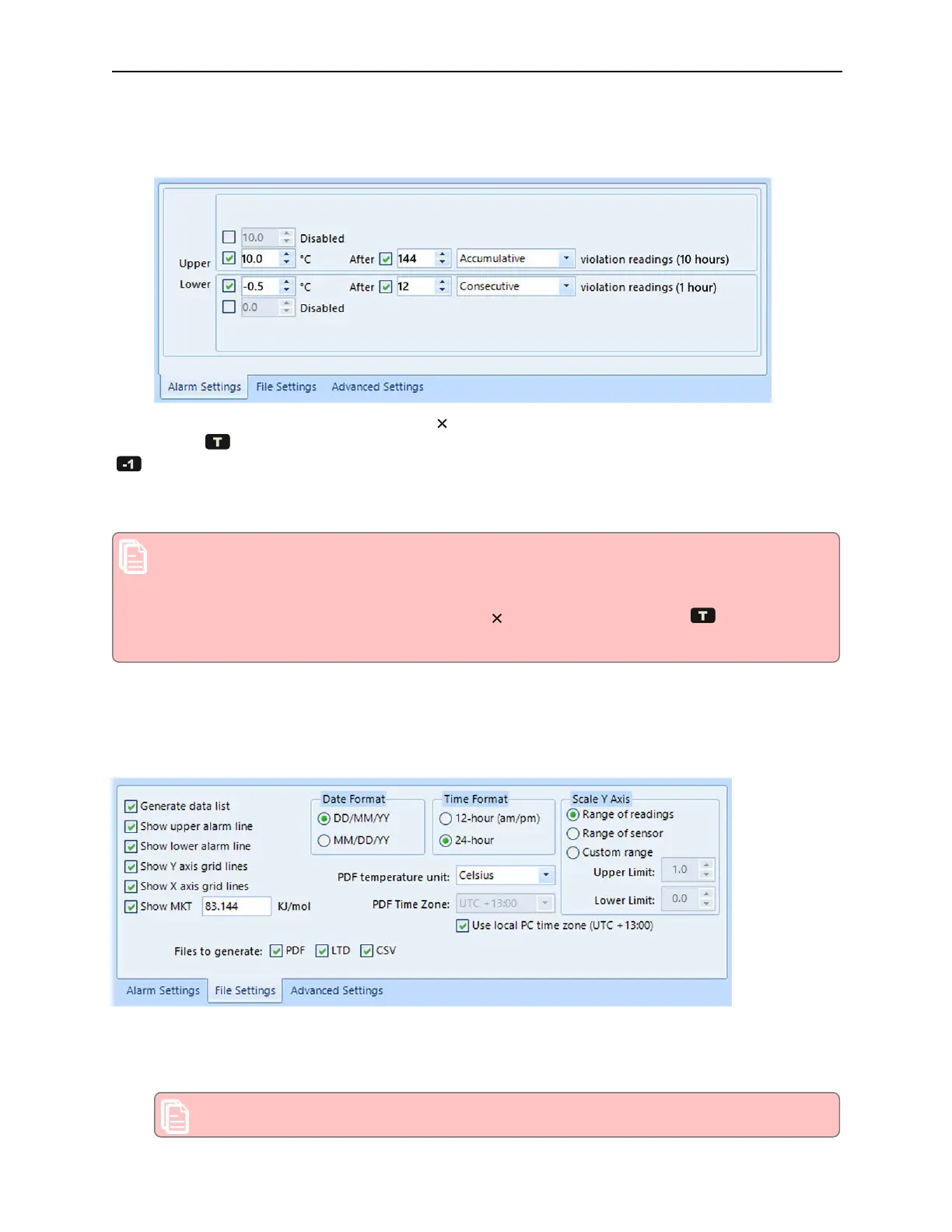 l the upper alarm is triggered when the temperature is 10.0°C or above for an accumulative time of 10