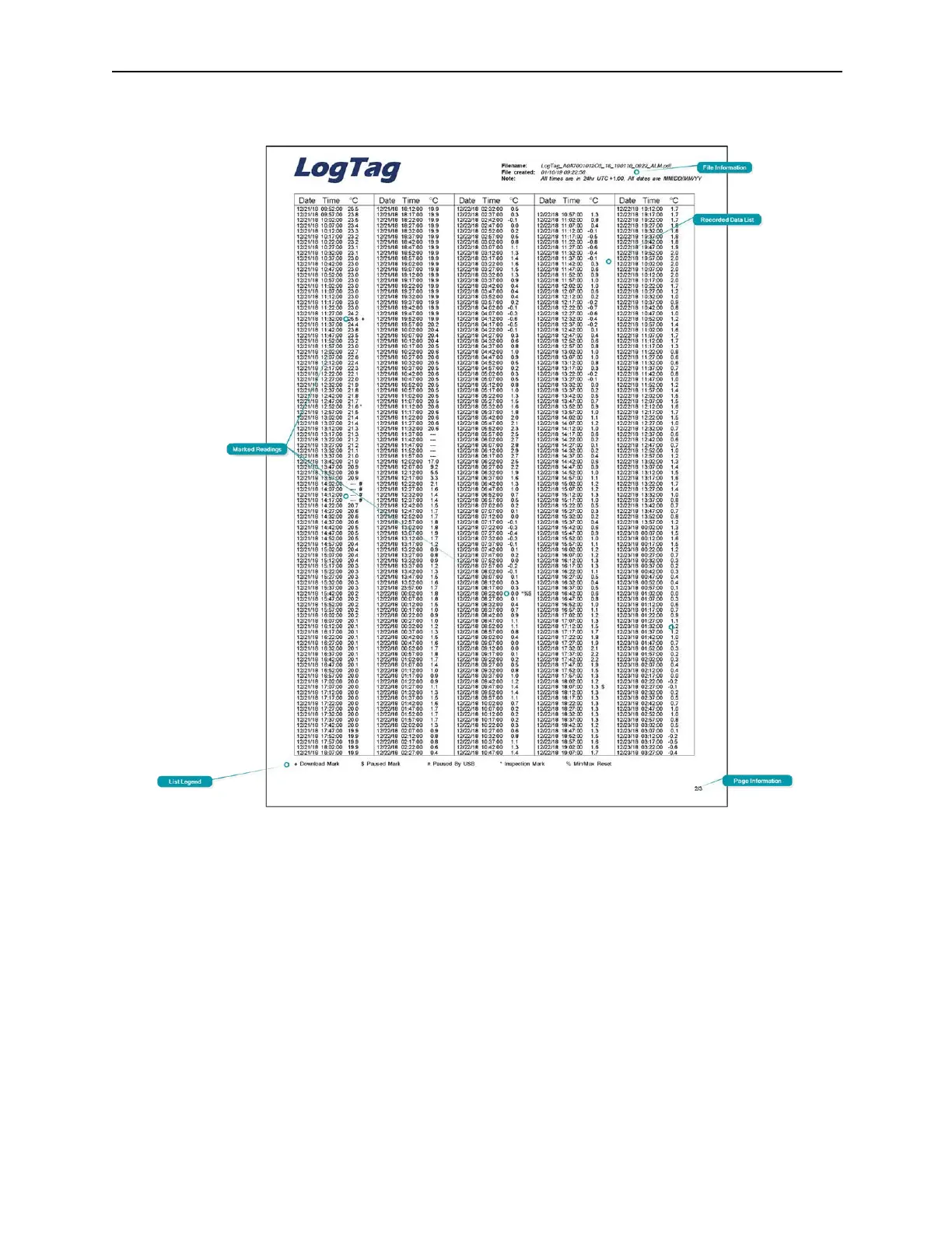 The Data list shows a single row for each recorded reading, showing the date, time and temperature values,
