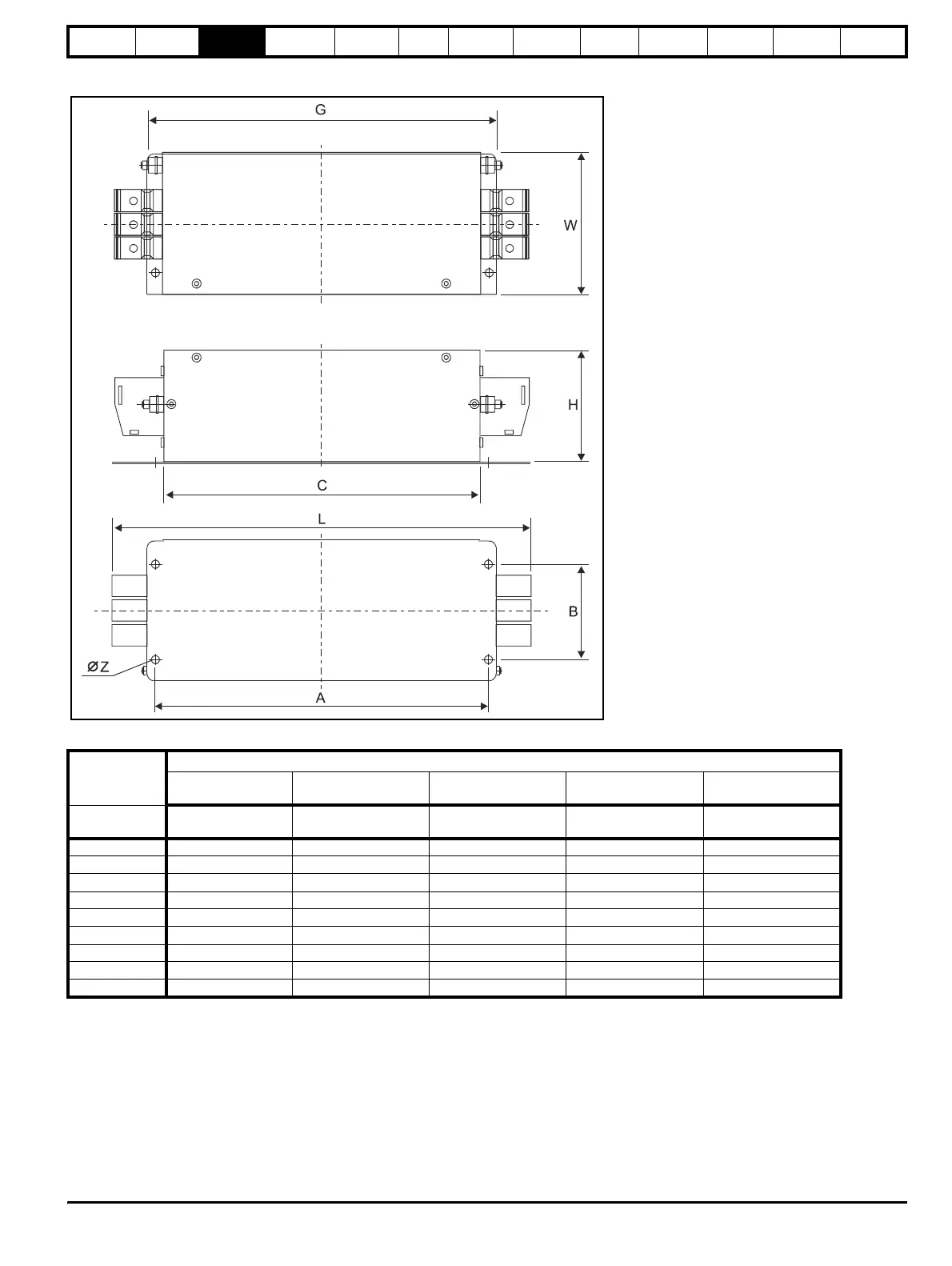 Figure 3-27 Unidrive size 3 (UNI3203 to UNI3204, UNI3404 to UNI3405) & size 4 bookcase mounted filter
