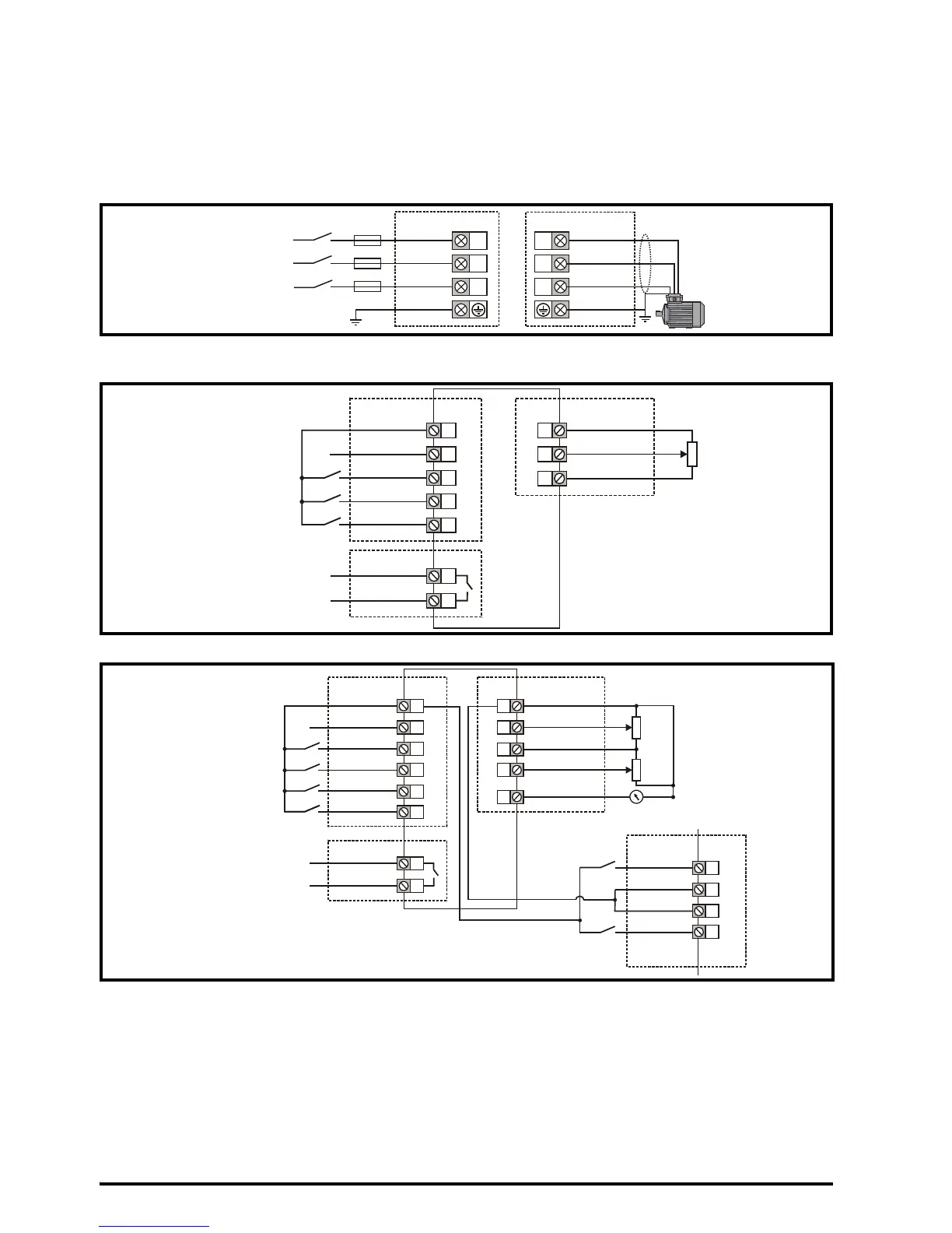 M100/M200/M300 : Le schéma de câblage correspond à la configuration par défaut du variateur (Pr 05 réglé sur AV)
